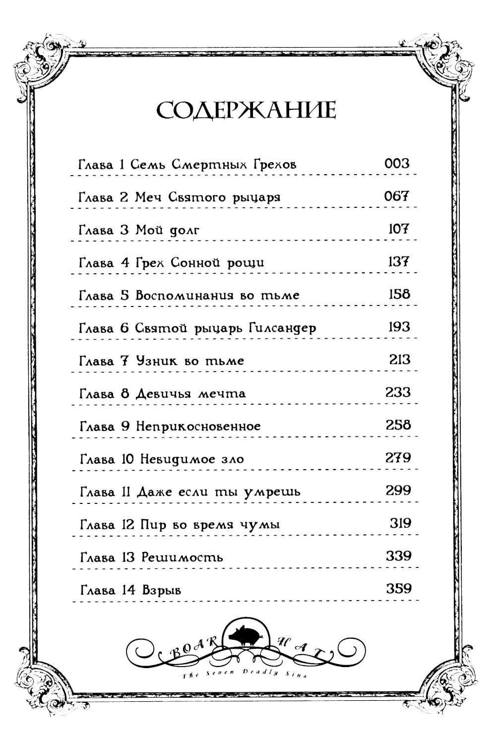 Для королевства Лионесс настали черные дни: власть захватила элита королевских войск, Святые Рыцари, которые заточили в тюрьму королевскую семью и творят в стране произвол. Принцессе Элизабет удается сбежать, и она решает искать помощи у легендарных рыцарей-мятежников, которые известны в народе как Семь Смертных Грехов. По счастливой случайности девушка забредает в весьма странный кабак, хозяином которого оказывается как раз один из тех, кого она ищет: Смертный Грех Гнева, Мелиодас. Он соглашается помочь Элизабет и отправляется с ней на поиски бывших товарищей...| Издательство | ЭксЭл Медиа |