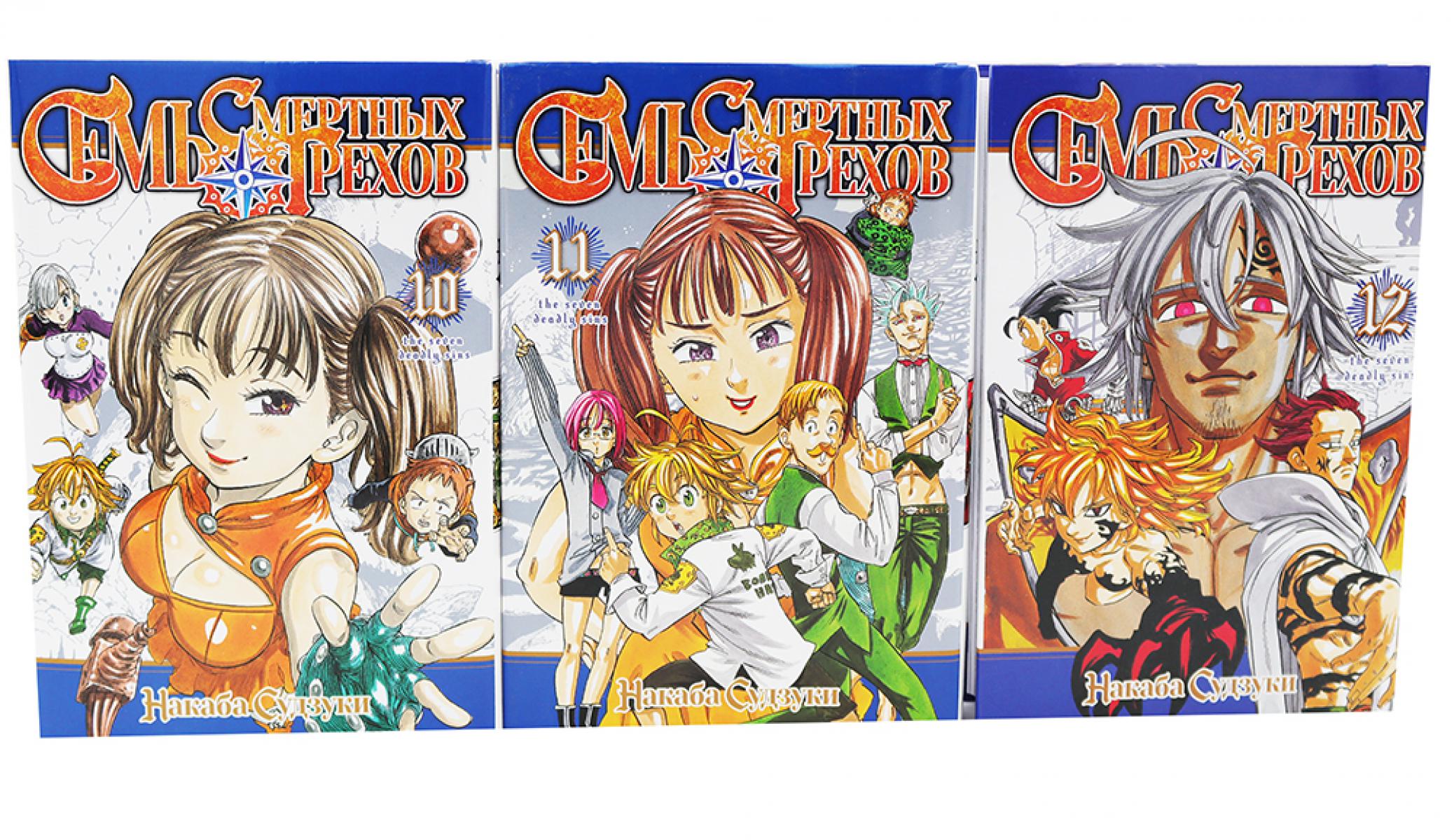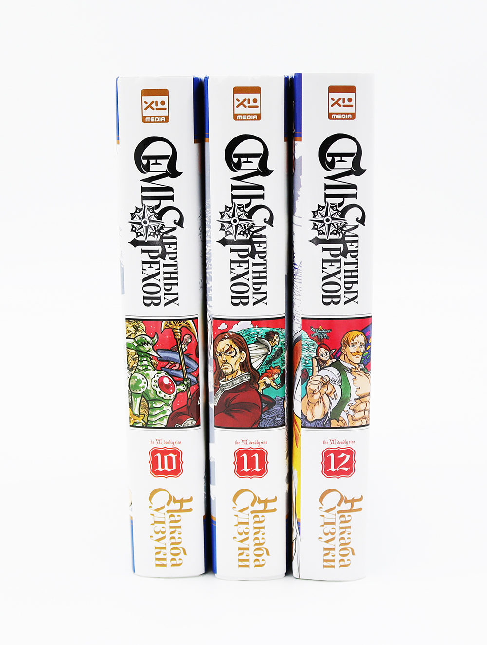 Комплект состоит из трех томов (10-12) манги Накабы Судзуки «Семь смертных грехов». В десятом томе вернув былую силу, Мелиодас отправляется к Десяти Заповедям, чтобы предупредить их не делать глупостей. Однако обозленные демоны не собираются отступать: вместо этого они решают поскорее провести великую жатву и захватить Британию! Даже добровольный изгнанник Бан сталкивается с ними и вступает в тяжелейшую схватку. Но до этого он вновь обретает приемного отца и возлюбленную.... В одиннадцатом томе Десять Заповедей, стремясь собрать души, подготовили несколько ловушек. Одна из них - Лабиринт Смерти Долора и Глоксинии, который представлен Британии как праздничный турнир в Вайзеле. Семь Смертных Грехов отправляются туда и воссоединяются с друзьями и бывшими врагами. Но что делать, если всех поделили на пары и отправили биться друг с другом насмерть? Ответ знает лишь Грех Львиной Гордыни Эсканор, для которого даже в полном мраке светит ослепительно-яркое солнце... В двенадцатом томе ловушка Десяти Заповедей сработала, Мелиодас мертв, и теперь всю Британию окутал мрак. Демоны с помощью смертных собирают человеческие души, на Святых рыцарей открылась охота. Но кабак «Свиная Шляпа» по-прежнему путешествует по глубинкам, разыскивая крупицы полезных сведений. И вот однажды в «Свиную Шляпу» заявляется призрак в серебряных латах... Что сулит его приход? И что случилось с остальными Смертными Грехами?| Издательство | ЭксЭл Медиа |