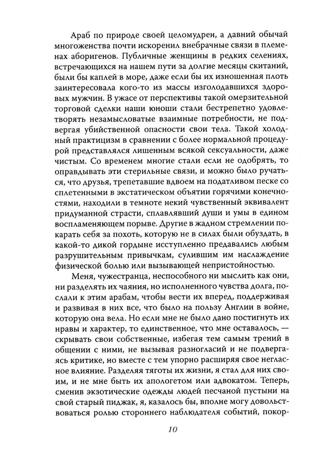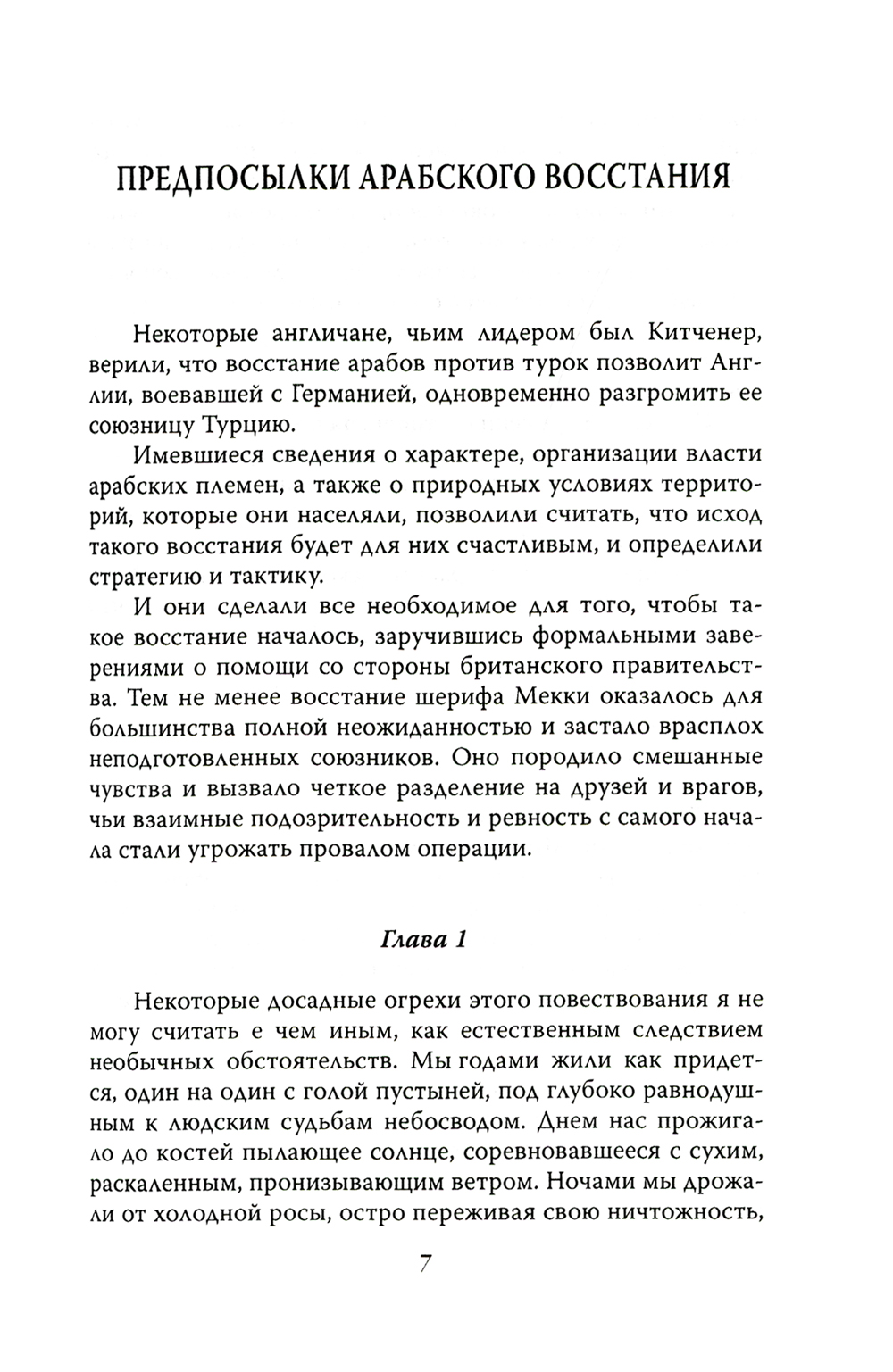 Томас Эдвард Лоуренс (1888-1935) - легендарная фигура времен Первой мировой воины. Лоуренс был английским разведчиком в Аравии и одновременно мечтал об освобождении арабского народа. "Я считаю его одним из величайших людей, живших в наше время" - так высказывался о своем бывшем советнике Томасе Лоуренсе Уинстон Черчилль. Книга Томаса Эдварда Лоуренса повествует об арабском восстании 1916-1918 гг. , которое привело к образованию первых независимых арабских государств. Лоуренс (Лоуренс Аравийский) стал культовой фигурой для Европы 20-30-х гг. благодаря тому, что его военная карьера привнесла в историю Первой мировой войны полузабытые нотки романтики и авантюры. Написанная ярким языком, книга Т. Э. Лоуренса читается как приключенческий роман, на страницах которого экзотика феодальной Аравии сочетается с прозой бронеавтомобилей, самолетов и технологической войны начала XX столетия.