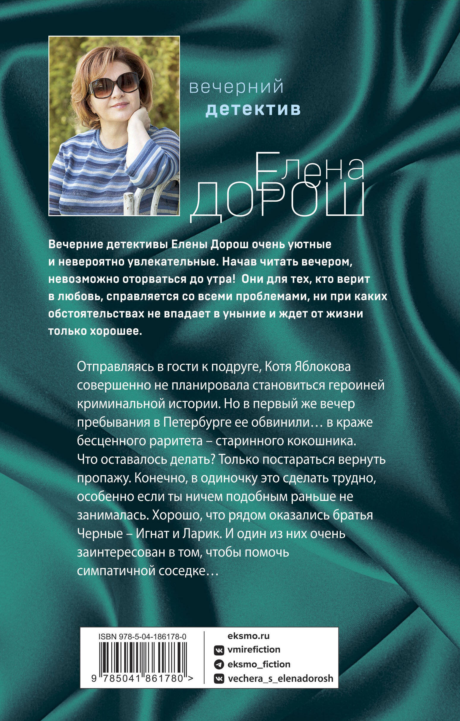 Отправляясь в гости к подруге, Котя Яблокова совершенно не планировала становиться героиней криминальной истории. Но в первый же вечер пребывания в Петербурге ее обвинили… в краже бесценного раритета - старинного кокошника. Что оставалось делать? Только постараться вернуть пропажу. Конечно, в одиночку это сделать трудно, особенно если ты ничем подобным раньше не занималась. Хорошо, что рядом оказались братья Черные - Игнат и Ларик, и один из них очень заинтересован в том, чтобы помочь симпатичной соседке. Вот только по нынешним временам кокошник стоит немалых денег, поэтому просто так его возвращать никто не собирается… В основе сюжетной линии остросюжетных романов Елены Дорош всегда лежит простая человеческая история. Они привлекают необыкновенно уютной атмосферой, душевностью и глубоким психологизмом в описании человеческих чувств.| Издательство | ООО "Издательство "Эксмо" |