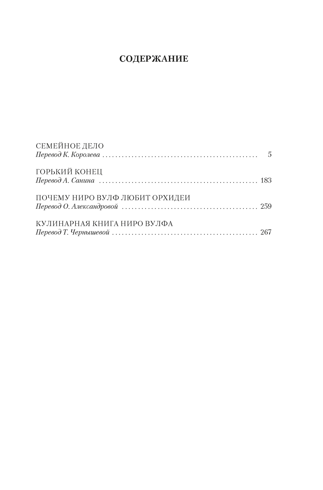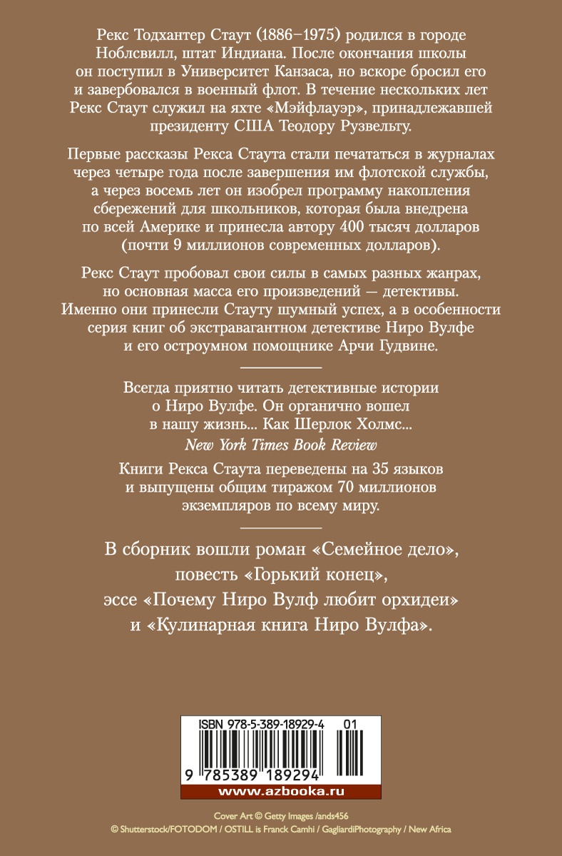 Ниро Вулф, страстный коллекционер орхидей, большой гурман, любитель пива и великий сыщик, практически никогда не выходит из дому. Все преступления он распутывает на основе тех фактов, которые собирает Арчи Гудвин, его обаятельный, ироничный помощник с отличной памятью. Никогда еще в стенах особняка Ниро Вулфа не случалось убийств. Официант Пьер Дакос из ресторана «Рустерман», явившийся ночью в дом сыщика, заявляет, что на него готовится покушение, и требует встречи с Вулфом. Арчи Гудвин, чтобы не будить шефа, предлагает Пьеру переночевать в их доме и встречу перенести на утро. И когда все успокоились, в доме грохочет взрыв. Замаскированная под сигару бомба взрывается у Пьера в руке… Что еще остается сыщику, как не взяться расследовать преступление («Семейное дело»). Личный повар Вулфа заболевает гриппом, и сыщик вынужден временно перейти на пищу из лавки деликатесов. Но какова же была степень негодования сыщика, когда в паштете, купленном Арчи Гудвином в лавке, был обнаружен хинин. Неужели Ниро Вулфа кто-то собирался отравить? Сыщик начинает собственное расследование, и оно приводит к непредсказуемым результатам… («Горький конец») Для читателей не секрет, что традиционная трапеза, приготовленная Фрицем Бреннером, личным поваром Ниро Вулфа и кулинаром высшего класса, непременно присутствует в каждом романе Стаута. В «Кулинарной книге», завершающей этот сборник, собраны рецепты любимых блюд знаменитого детектива («Кулинарная книга Ниро Вулфа»). Большинство произведений, вошедших в сборник, даны в новых переводах или публикуются впервые.| Издательство | Иностранка |