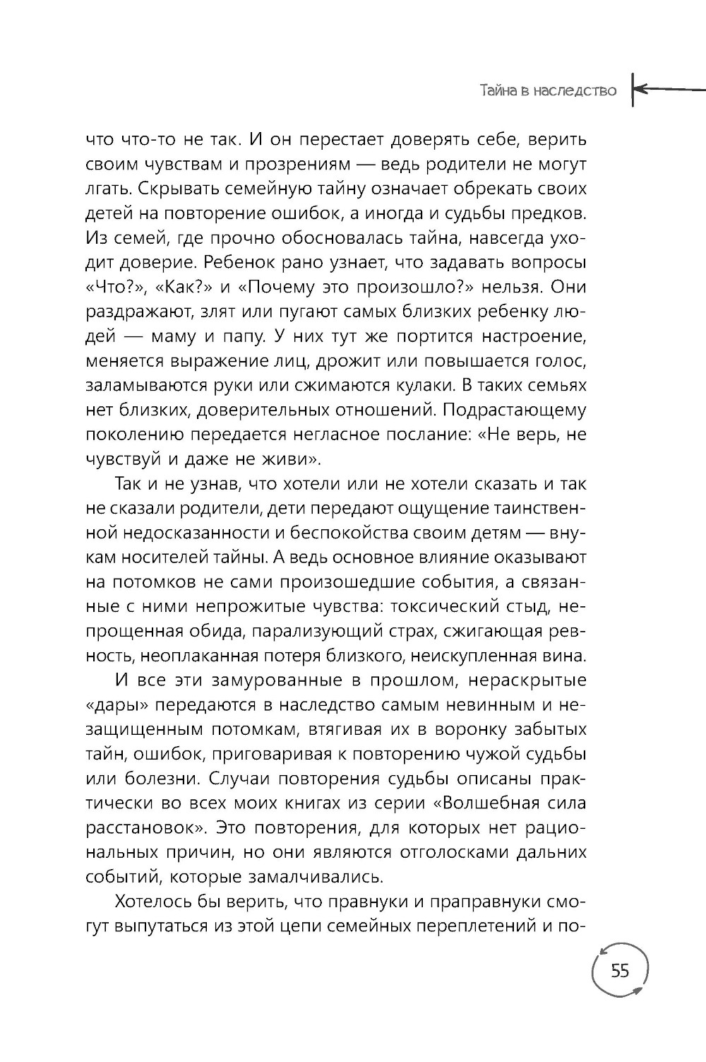 Надежда Маркова - психотерапевт с богатым опытом работы, автор бестселлеров по системным расстановкам. В книге она рассказывает, какие последствия для потомков могут быть, если скрывать от родственников тайны, которые относятся к истории вашего рода и, в случае раскрытия, могут запятнать образ семьи. Скрывают "позорные" смерти: убийство или самоубийство, смерти от криминальных абортов, алкоголизма, наркотической зависимости. Не предаются огласке бесплодие, развод, разорение, подлые поступки, нелады с законом, дурная наследственность. Умалчиваются брошенные, абортированные, незаконнорожденные и приемные дети, измена, предательство любого рода, насилие со стороны родственников.