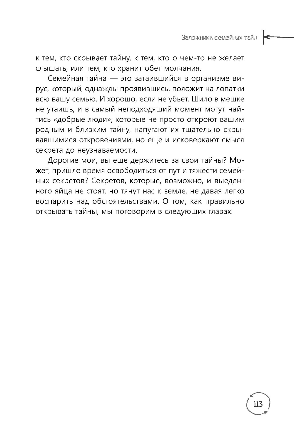 В этой книге вы увидите на примере жизненных историй клиентов автора и проведенных для них расстановочных сессий, как тайны ныне живущих или уже умерших родственников влияют на нашу жизнь и судьбу наших детей и внуков. Вы узнаете, что безопаснее для вас и рода - открыться или скрывать тайну, как не стать заложником секретного заговора молчания, как нейтрализовать разрушающие последствия тайны и очистить род от влияния далекого прошлого семьи. В приложении представлены разрешающие фразы, облегчающие психоэмоциональное состояние, к ним можно обращаться вне контекста расстановок.