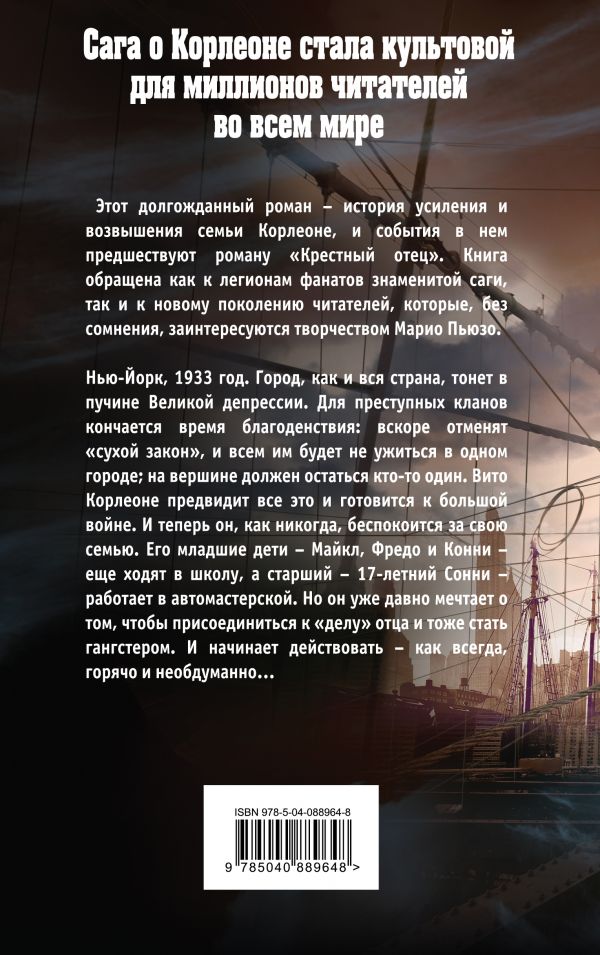 Этот долгожданный роман - история усиления и возвышения семьи Корлеоне, и события в нем предшествуют роману "Крестный отец". Книга обращена как к легионам фанатов знаменитой саги, так и к новому поколению читателей, которые, без сомнения, заинтересуются творчеством Марио Пьюзо.