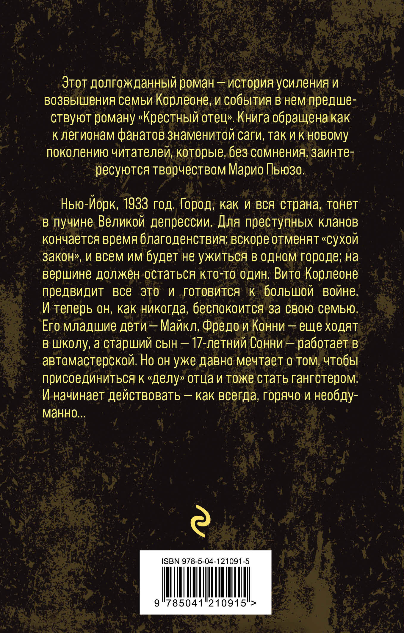 Этот долгожданный роман - история усиления и возвышения семьи Корлеоне, и события в нем предшествуют роману «Крестный отец». Книга обращена как к легионам фанатов знаменитой саги, так и к новому поколению читателей, которые, без сомнения, заинтересуются творчеством Марио Пьюзо. Нью-Йорк, 1933 год. Город, как и вся страна, тонет в пучине Великой депрессии. Для преступных кланов кончается время благоденствия: вскоре отменят «сухой закон», и всем им будет не ужиться в одном городе; на вершине должен остаться кто-то один. Вито Корлеоне предвидит все это и готовится к большой войне. И теперь он, как никогда, беспокоится за свою семью. Его младшие дети - Майкл, Фредо и Конни - еще ходят в школу, а старший - 17-летний Сонни - работает в автомастерской. Но он уже давно мечтает о том, чтобы присоединиться к «делу» отца и тоже стать гангстером. И начинает действовать - как всегда, горячо и необдуманно…