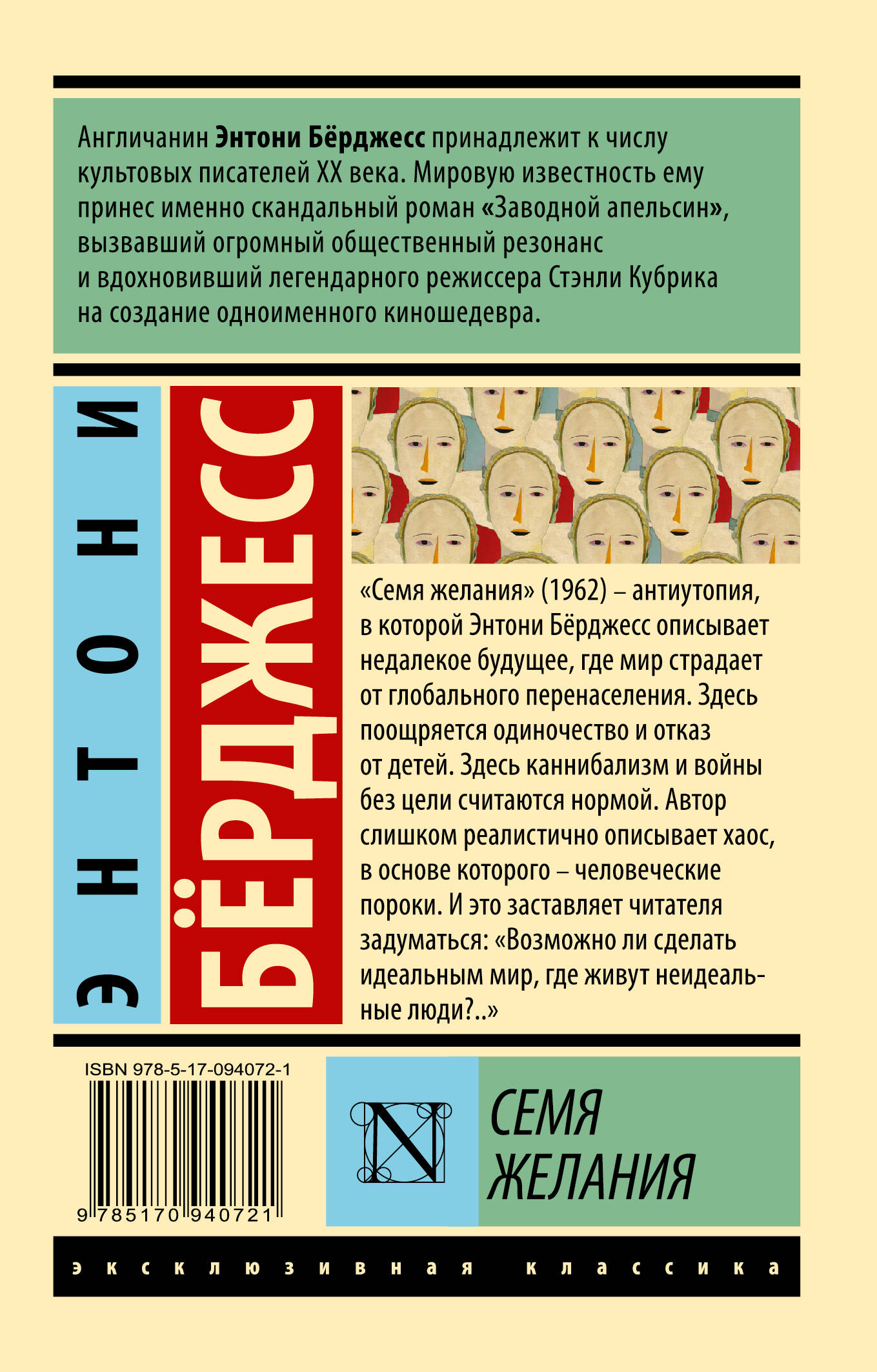 "Семя желания" (1962) - антиутопия, в которой Энтони Бёрджесс описывает недалекое будущее, где мир страдает от глобального перенаселения. Здесь поощряется одиночество и отказ от детей. Здесь каннибализм и войны без цели считаются нормой. Автор слишком реалистично описывает хаос, в основе которого - человеческие пороки. И это заставляет читателя задуматься: "Возможно ли сделать идеальным мир, где живут неидеальные люди?.."| Издательство | ИЗДАТЕЛЬСТВО "АСТ" |