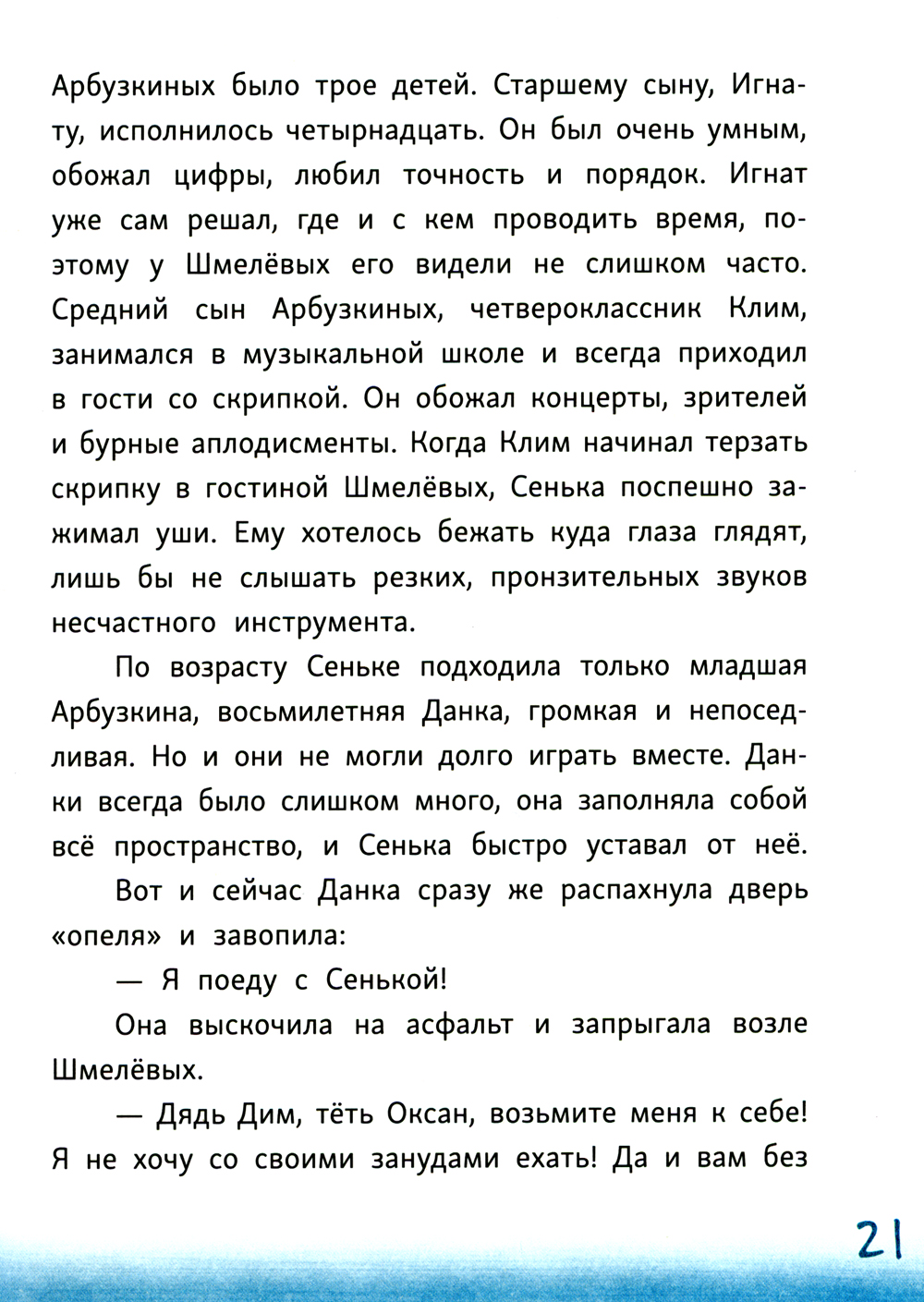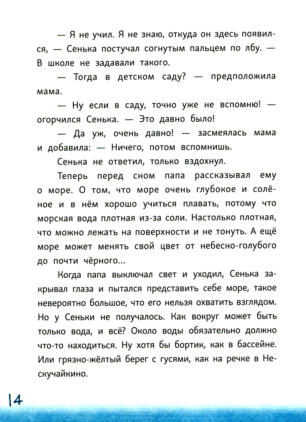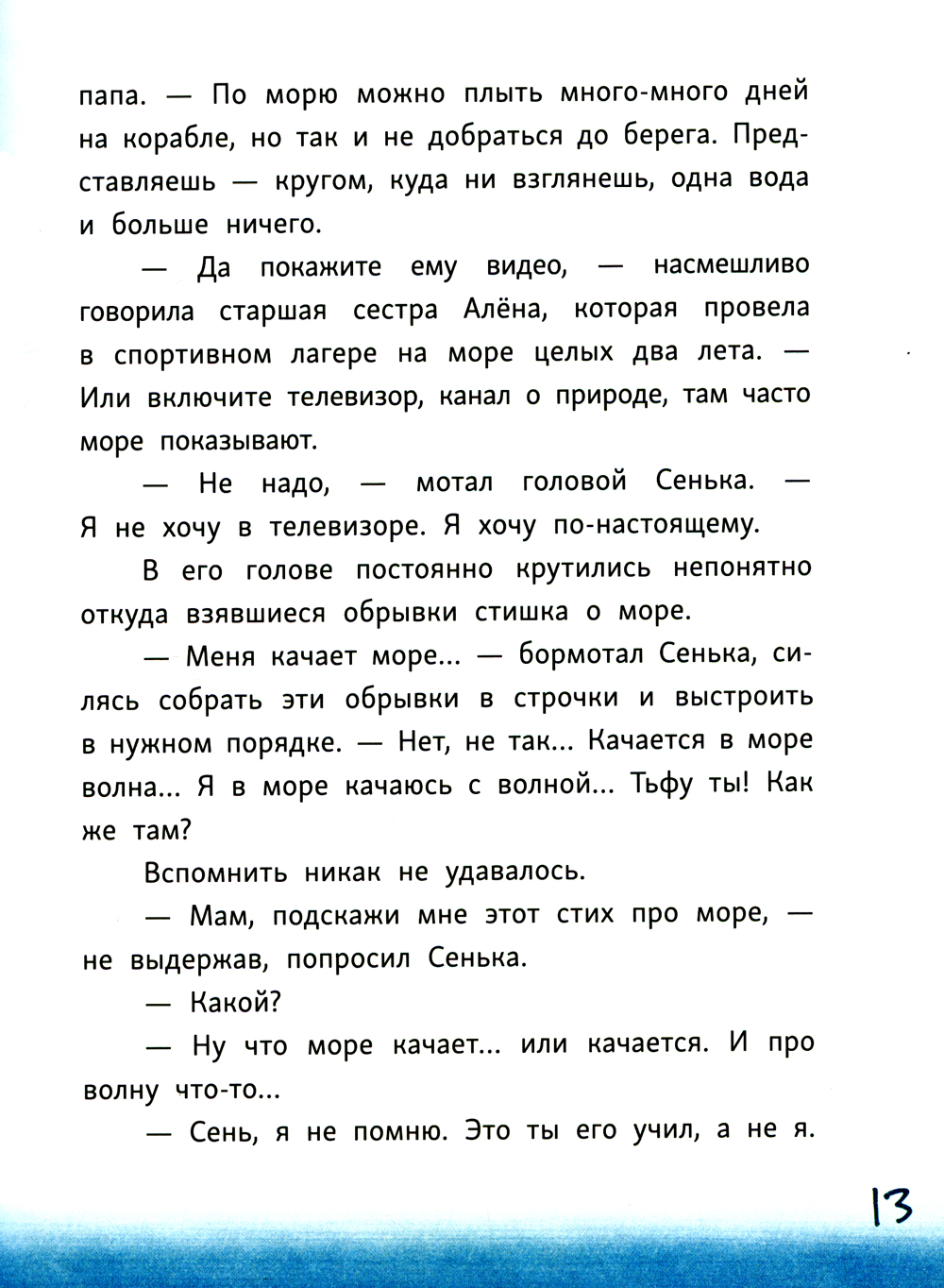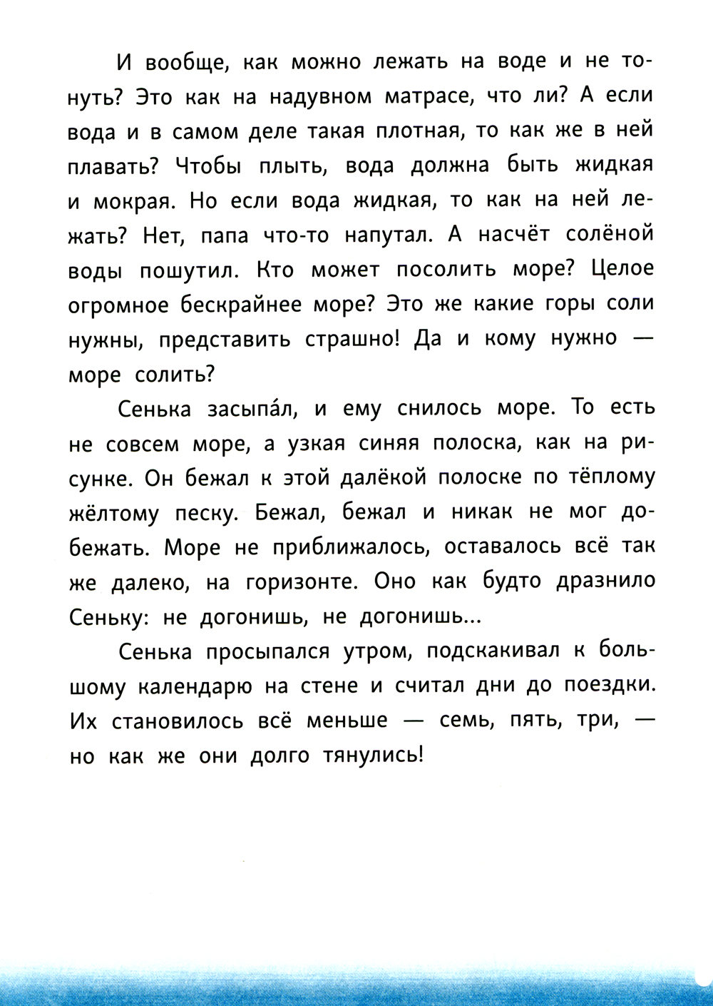 Сенька Шмелёв окончил первый класс и впервые в жизни едет с родителями на море. Он и представить себе не мог, насколько оно невероятное: огромное, шумное, солёное... В бескрайних водных просторах живут дельфины и прозрачные медузы, а берег усыпан блестящими гладкими камушками. Сколько секретов оно хранит! И если внимательно наблюдать, может быть, море согласится раскрыть хотя бы некоторые из них? Виктория Ледерман - классик современной детской литературы и лауреат множества премий, среди которых - «Книгуру», Корнейчуковская, Крапивинская, «Алиса», посвященная памяти Кира Булычёва. От Калининграда до Владивостока мальчишки и девчонки с удовольствием читают книги Виктории Ледерман и узнают в персонажах себя и своих сверстников. Герой её новой повести Сенька Шмелёв - мечтательный, немного застенчивый, но верящий в чудеса. Не сомневаемся, что и вы захотите с ним подружиться!| Издательство | Пять четвертей |