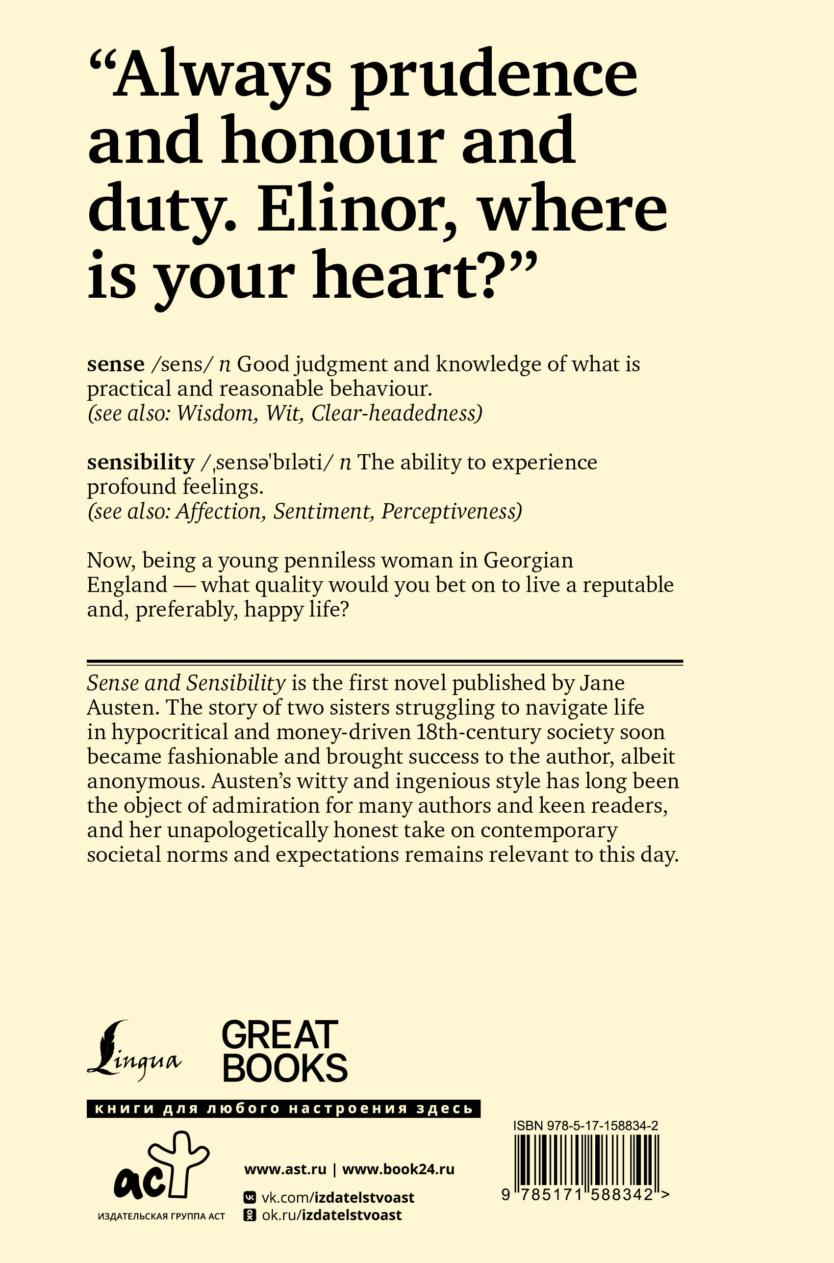 Разум - мыслительная способность, позволяющая логически осмыслять действительность. Чувство - способность воспринимать внешние воздействия; также "эмоция" или "переживание". Итак, представьте, что вы молодая девушка в Англии XVIII века, не замужем и без гроша в кармане - какое из этих качеств вы выберете, чтобы сохранить достоинство и прожить счастливую жизнь? "Разум и чувство" - роман Джейн Остен о двух сестрах-бесприданницах, которые пытаются обрести счастье в лицемерном аристократическом обществе эпохи Регентства. Остроумный и афористичный слог Остен, лишенный чрезмерной сентиментальности и витиеватости, завоевал сердца читателей по всему миру, а ее беспристрастный взгляд на существующие социальные порядки и роли по сей день не теряет остроты. Насладитесь романом Джейн Остен на языке оригинала без сокращений и адаптации.