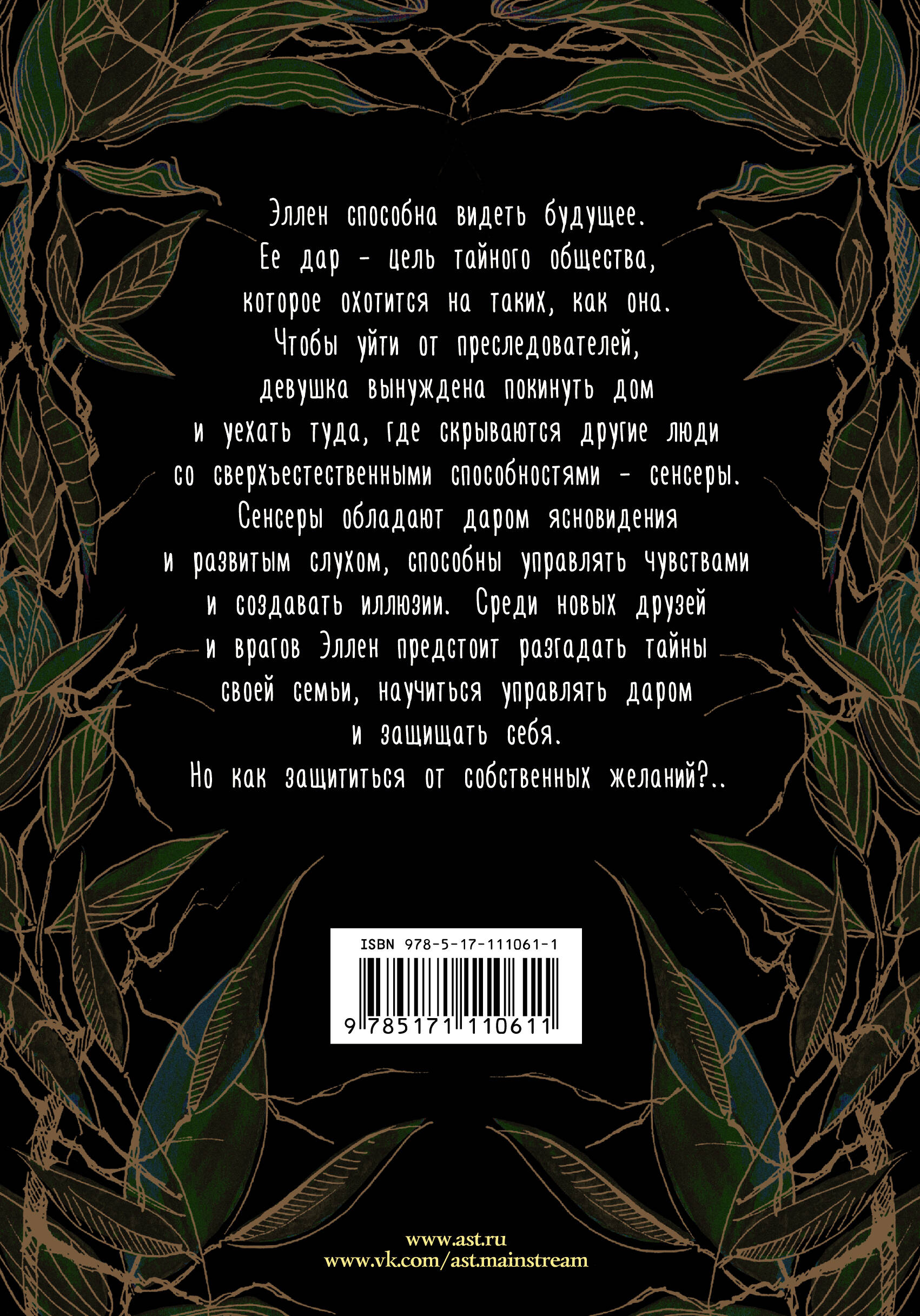 Эллен способна видеть будущее. Ее дар - цель тайного общества, которое охотится на таких, как она. Чтобы уйти от преследователей, девушка вынуждена покинуть дом и уехать туда, где скрываются другие люди со сверхъестественными способностями - сенсеры. Сенсеры обладают даром ясновидения и развитым слухом, способны управлять чувствами и создавать иллюзию. Среди новых друзей и врагов Эллен предстоит разгадать тайны своей семьи, научиться управлять даром и защищать себя. Но как защититься от собственных желаний?| Издательство | ИЗДАТЕЛЬСТВО "АСТ" |