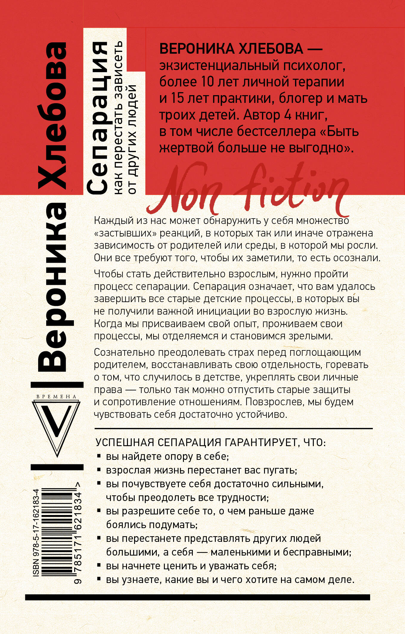 Вероника Хлебова - экзистенциальный психолог, 10 лет личной терапии и 15 лет практики, блогер и мать троих детей. Автор 4 книг, в том числе бестселлера "Быть жертвой больше не выгодно". Каждый из нас может обнаружить у себя множество "застывших" реакций, в которых так или иначе отражена зависимость от родителей или среды, в которой мы росли. Они все требуют того, чтобы их заметили, то есть осознали. Чтобы стать действительно взрослым, нужно пройти процесс сепарации. Сепарация означает, что вам удалось завершить все старые детские процессы, в которых вы не получили важной инициации во взрослую жизнь. Когда мы присваиваем свой опыт, проживаем свои процессы, мы отделяемся и становимся зрелыми. Сознательно преодолевать страх перед поглощающим родителем, восстанавливать свою отдельность, горевать о том, что случилось в детстве, укреплять свои личные права - только так можно отпустить старые защиты и сопротивление отношениям. Повзрослев, мы будем чувствовать себя достаточно устойчиво. Прочитав книгу "Сепарация: как перестать зависеть от других людей": • вы найдете опору в себе; • взрослая жизнь перестанет вас пугать; • вы разрешите себе то, о чем раньше даже боялись подумать; • вы перестанете представлять других людей большими, а себя - маленькими и бесправными; • вы начнете ценить и уважать себя; • вы узнаете, какие вы и чего хотите на самом деле. "Если представить психологические проблемы человека в виде метафорического клубка размером с футбольный мяч, то проблема сепарации - из тех ниточек, за которые стоит потянуть, чтобы весь клубок распутать. Вероника Хлебова ненавязчиво указывает читателю, как правильно за эту ниточку тянуть, не множа хаос, а реально решая проблемы. "Тяните аккуратно, в вашем темпе, без оглядки на окружающих", - говорит она своей книгой. И когда клубок начнет распутываться, вы заметите, как и с близкими отношения налаживаются, и с нелюбимой работы уйти удается, и вообще - мечты начинают сбываться". © Александр Акулиничев, главный редактор сайта Psychologies.ru| Издательство | Издательство "АСТ" |