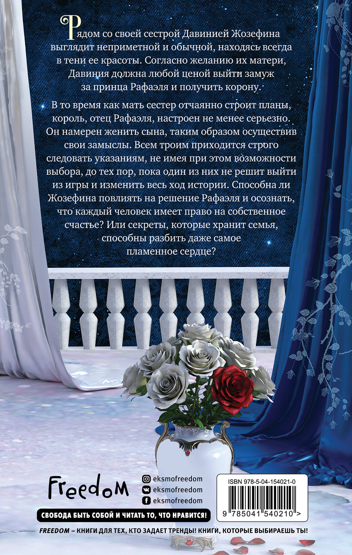 Он может довериться только ей, ведь она единственная девушка в замке, которая не хочет выходить замуж за принца. Рядом со своей сестрой Давинией Жозефина выглядит неприметной и обычной, находясь всегда в тени ее красоты. Согласно желанию их матери, Давиния должна любой ценой выйти замуж за принца Рафаэля и получить корону. В то время как мать сестер отчаянно строит планы, король, отец Рафаэля, настроен не менее серьезно. Он намерен женить сына, таким образом осуществив свои замыслы. Всем троим приходится строго следовать указаниям, не имея при этом возможности выбора, до тех пор, пока один из них не решит выйти из игры и изменить весь ход истории. Способна ли Жозефина повлиять на решение Рафаэля и осознать, что каждый человек имеет право на собственное счастье? Или секреты, которые хранит семья, способны разбить даже самое пламенное сердце? История девушки, которая всю жизнь скрывается в тени красоты своей сестры. Однажды жизнь преподносит ей неожиданный сюрприз, и теперь только ей решать, хочет ли она выбраться из замкнутого круга обыденной жизни и измениться навсегда. Новая сказка с вечными темами: зависть, ревность, власть, интриги, тайны и любовь. Хотите вновь побывать на страницах истории про Золушку? Тогда это именно то, что вам нужно. По атмосфере история напоминает роман «Книжные хроники Анимант Крамб»! Балы, тугие корсеты, интриги, тайны и, конечно, самая романтичная история любви, о которой мы мечтали еще с детства. № 13 в жанре «Бестселлеры. Историческое фэнтези» на портале Amazon.de. «По началу романа можно подумать, что это очередная адаптация Золушки. Но как бы не так. Главная героиня - смелая и упрямая, она способна пожертвовать всем ради благополучия своей семьи». - Amazon.de Даже самые страшные секреты невозможно хранить вечно. Жозефине откроется непростая правда, и как знать, уготовлен ли этой сказке счастливый конец?| Издательство | Эксмо |