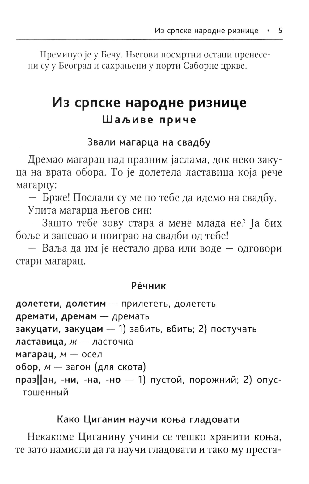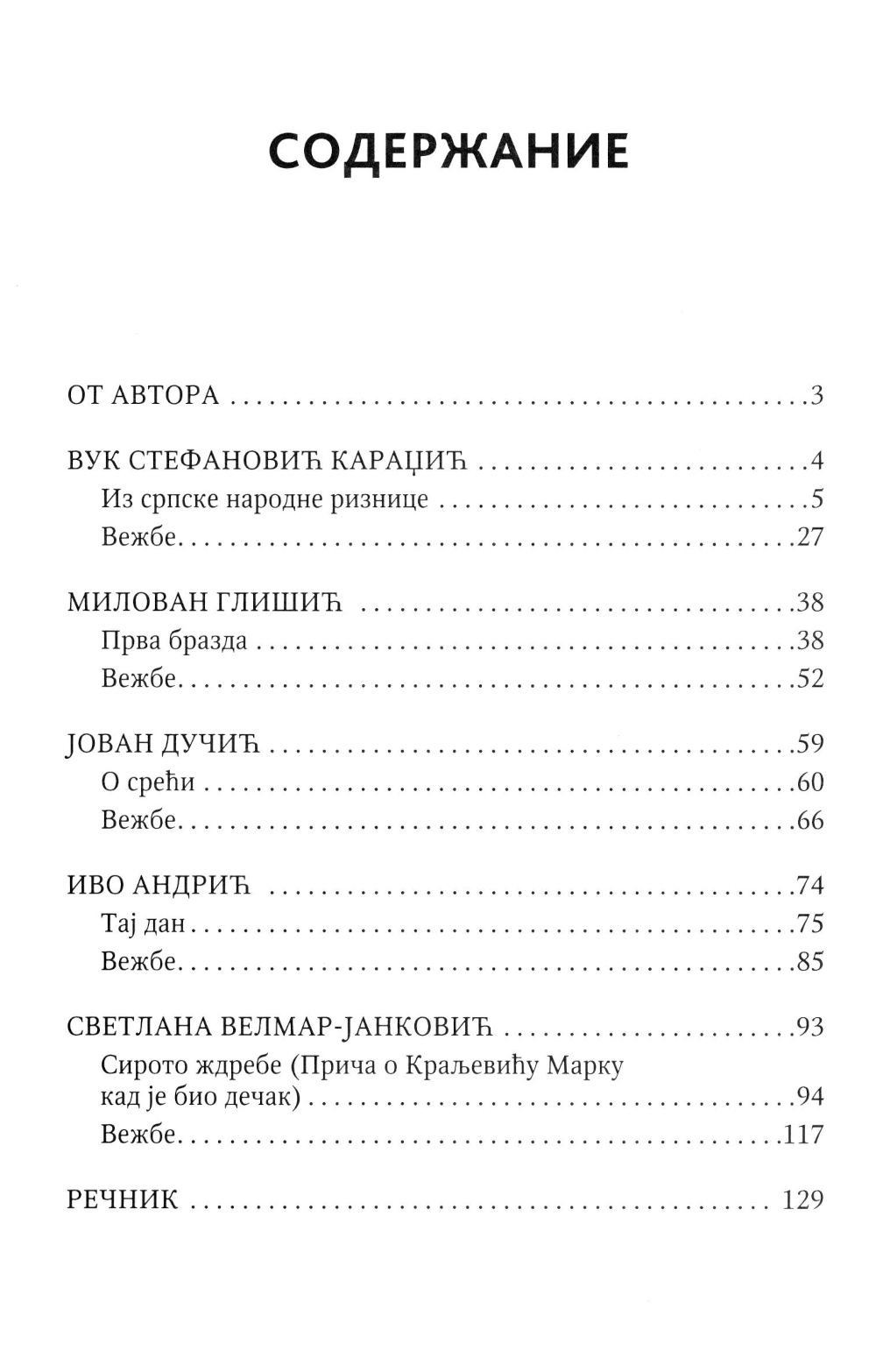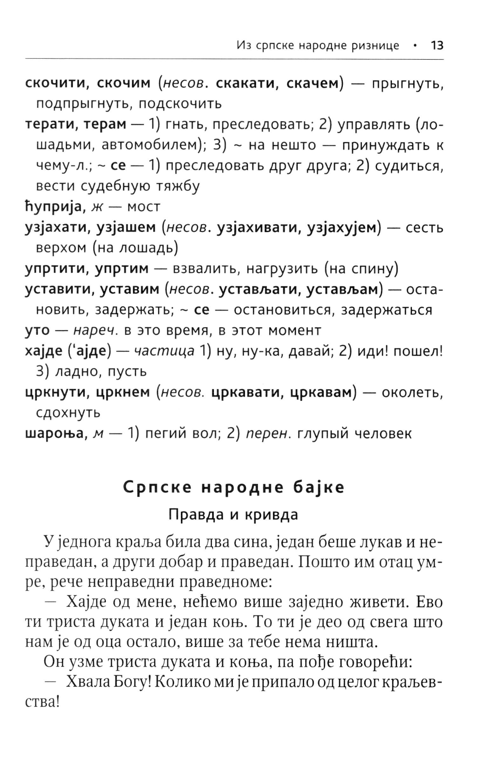 Предлагаемое учебное пособие предназначено для тех, кто овладел основами сербской грамматики и разговорной речи. В книгу включены народные сказки, рассказы, анекдоты, загадки, пословицы и поговорки, собранные знаменитым сербским филологом, историком и фольклористом Вуком Стефановичем Караджичем, а также рассказы, стихи и открывки из прозаических произведений известных сербских писателей.