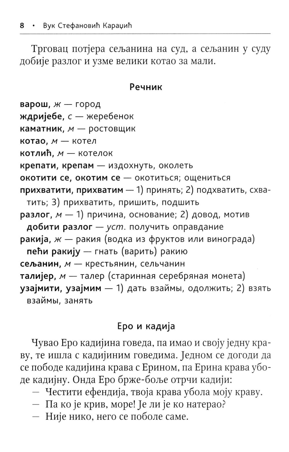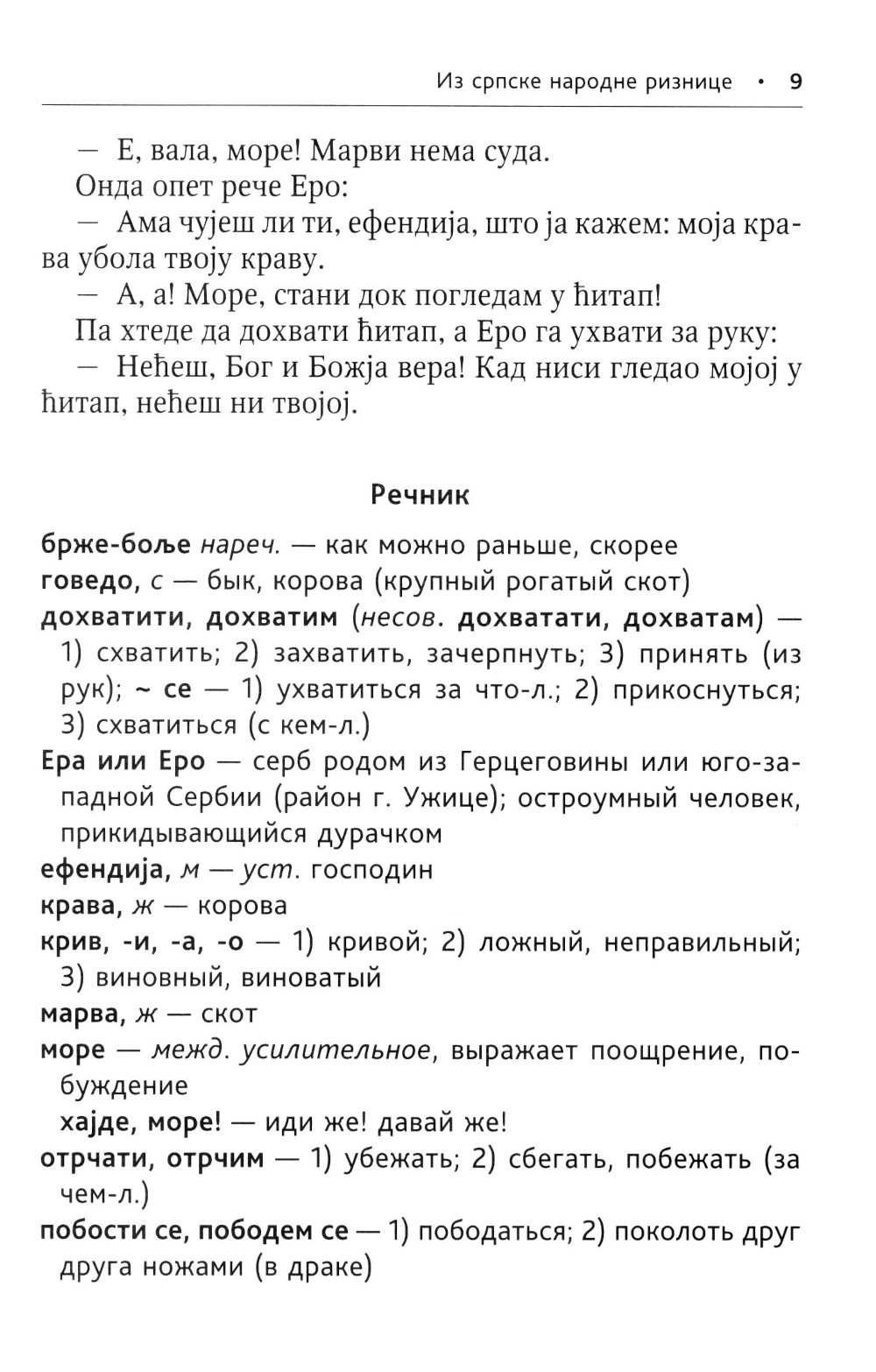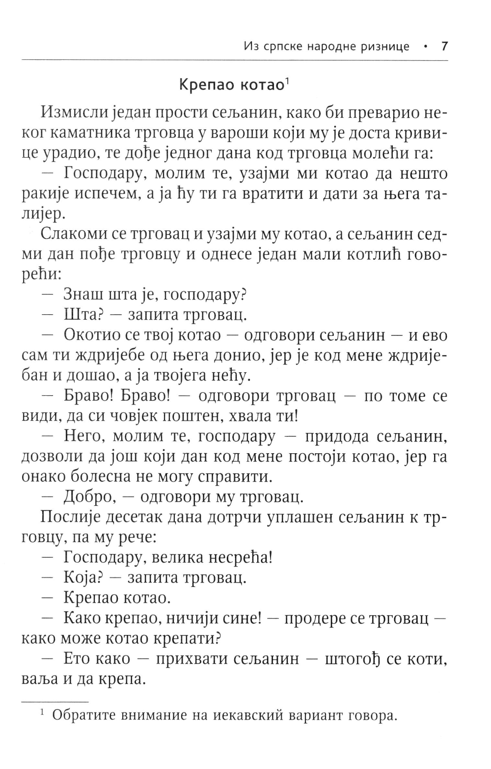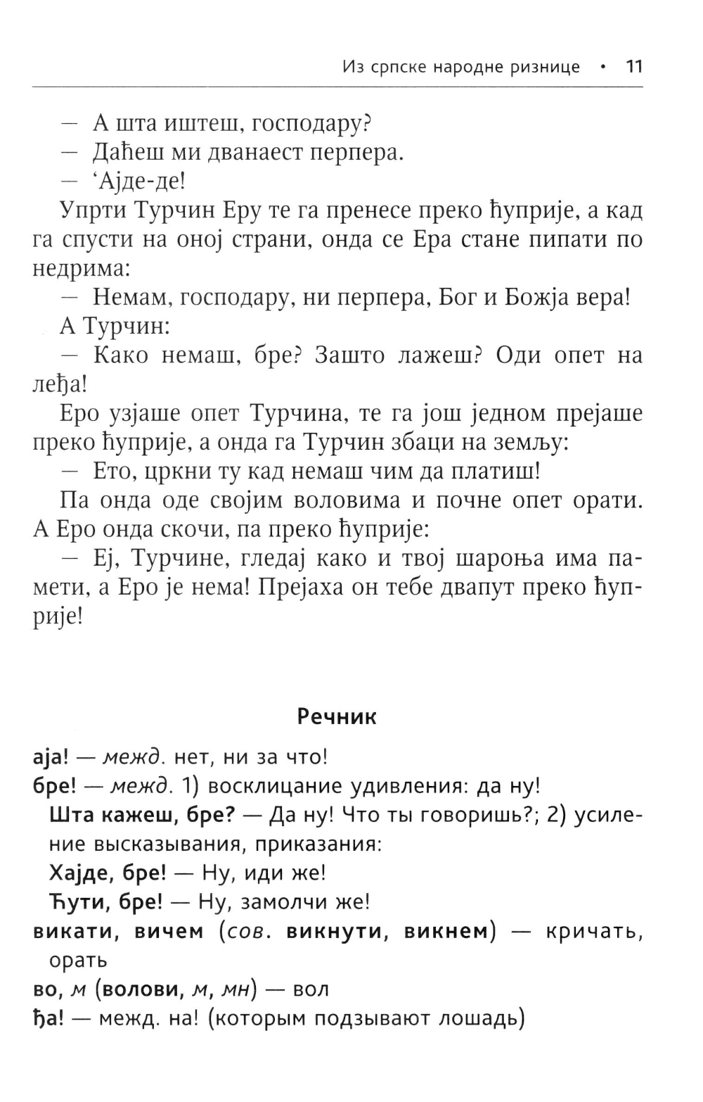 Предлагаемое учебное пособие предназначено для тех, кто овладел основами сербской грамматики и разговорной речи. В книгу включены народные сказки, рассказы, анекдоты, загадки, пословицы и поговорки, собранные знаменитым сербским филологом, историком и фольклористом Вуком Стефановичем Караджичем, а также рассказы, стихи и открывки из прозаических произведений известных сербских писателей.