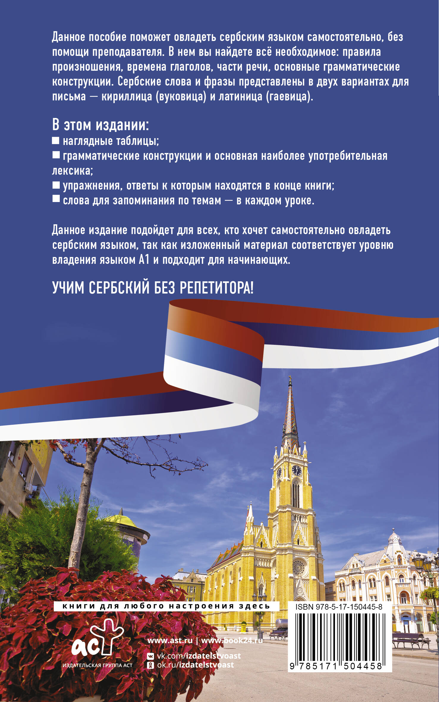 Данный самоучитель поможет читателям самостоятельно, без помощи преподавателя овладеть сербским языком на базовом уровне. В 30 уроках рассмотрены основные грамматические темы, полезная лексика для повседневного использования. В каждом уроке есть упражнения для успешного закрепления пройденной темы, ответы на которые расположены в конце книги. Материал в пособии изложен максимально понятно и доступно и сопровождается большим количеством наглядных таблиц. Пособие предназначается для широкого круга читателей, желающих изучить сербский язык самостоятельно.| Издательство | ИЗДАТЕЛЬСТВО "АСТ" |