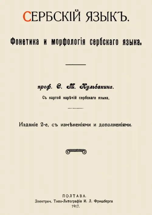 Репринт с издания. Полтава 1917. 2 -е издание с изменениями и дополнениями. С картой наречий сербского языка. Кульбакин Степан Михайлович (1873, Тифлис -1941, Белград) - русский филолог-славист, палеограф, профессор Харьковского и Белградского университетов, член Сербской академии наук. В СССР работы Кульбакина не издавались.