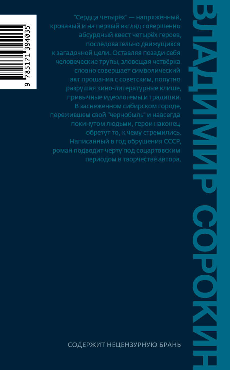 Четверо героев ведут кровопролитный и, в рамках текста, совершенно бессмысленный бой с остатками советской реальности, которая рушится буквально на глазах. Рукопись романа, законченная в 1991 году, попала в шорт-лист Букеровской премии. Самый безапелляционный, самый жесткий и один из самых сложных романов Владимира Сорокина. Гимн бессмысленности и невнятности человеческих действий: хаотичных, абсурдных и предельно жестоких. Как всегда - безупречное владение стилем и ловкое манипулирование основными символами и штампами эпохи. Конфликт здесь, как это почти всегда бывает у Сорокина, развивается не столько между персонажами, сколько между самими блоками текста: например, между живой устной речью и закостеневшим классическим литературным слогом. За этими приключениями русского языка следить ничуть не менее интересно и не менее страшно, чем за похождениями героев. Сорокин, словно фокусник, ловко манипулирует стилями от классической тургеневской прозы до советского производственного романа и заглядывает даже в уже постсоветские криминальные триллеры. Один из любимейших приемов Сорокина - материализованная метафора - достигает здесь поистине невероятных размеров и буквально оплетает собой весь роман.
