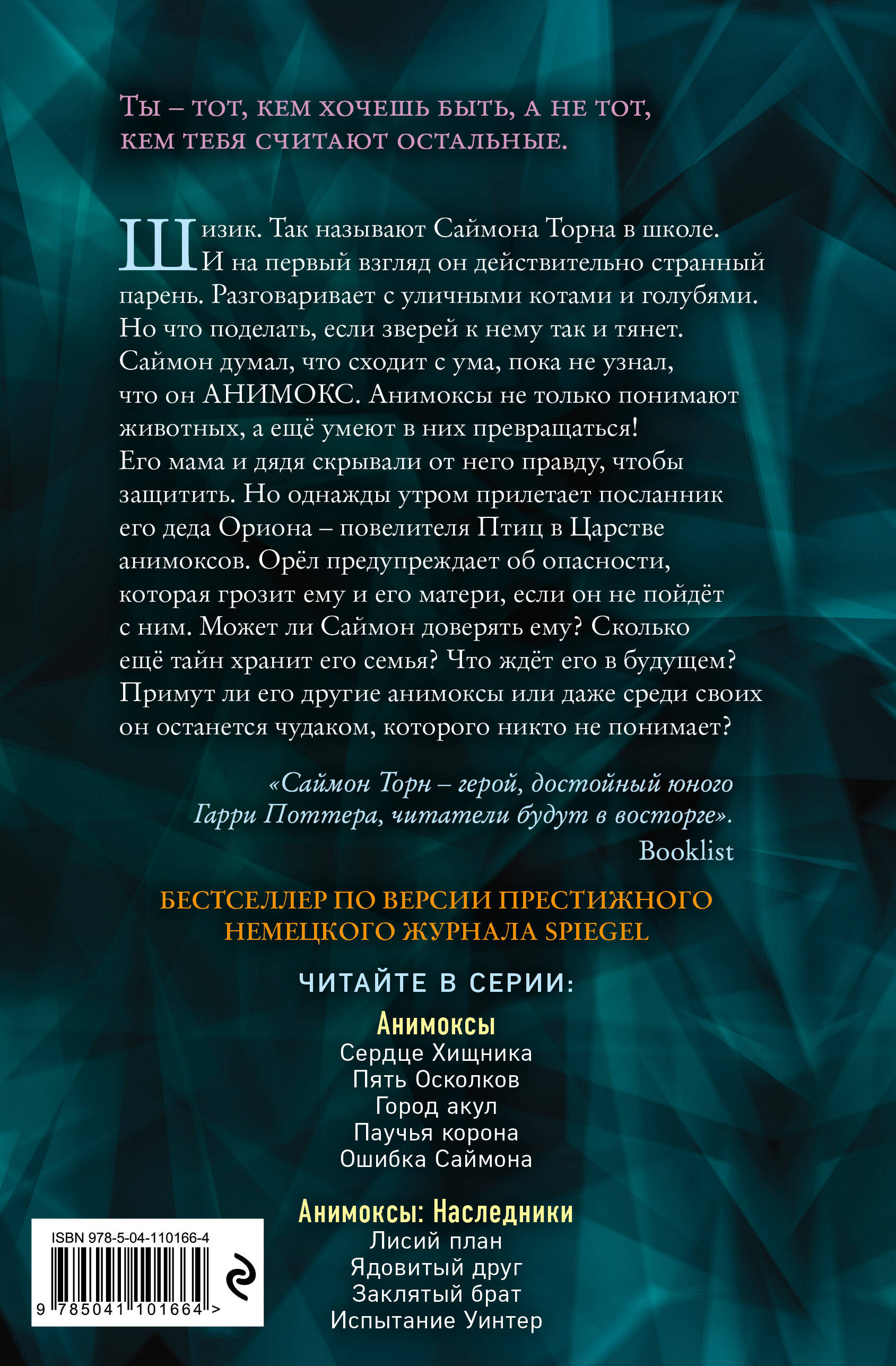 Первая часть в популярной серии «Анимоксы» от Эйми Картер. Саймон узнает о своей истинной природе и обретает друзей. Шизик. Так называют Саймона Торна в школе. И, на первый взгляд, он действительно странный парень. Разговаривает с уличными котами и голубями, но что поделать, если зверей к нему так и тянет. Саймон думал, что сходит с ума, пока не узнал, что он никакой не шизик, он АНИМОКС. Анимоксы не только понимают животных, а ещё умеют в них превращаться! Его мама и дядя скрывали от него правду. Но однажды утром прилетел посланник из Царства Птиц, который предупредил об опасности, грозящей ему и его матери. Может ли Саймон ему доверять? Что ждёт его в будущем? Примут ли его другие анимоксы или даже среди своих он останется чудаком, которого никто не понимает? Невероятные приключения, история о необычной школе, о дружбе, поиске себя и своей индивидуальности. В мире анимоксов хочется жить, героям хочется подражать. Понравится поклонникам «Детей леса» и «Детей моря»!| Издательство | ООО "Издательство "Эксмо" |