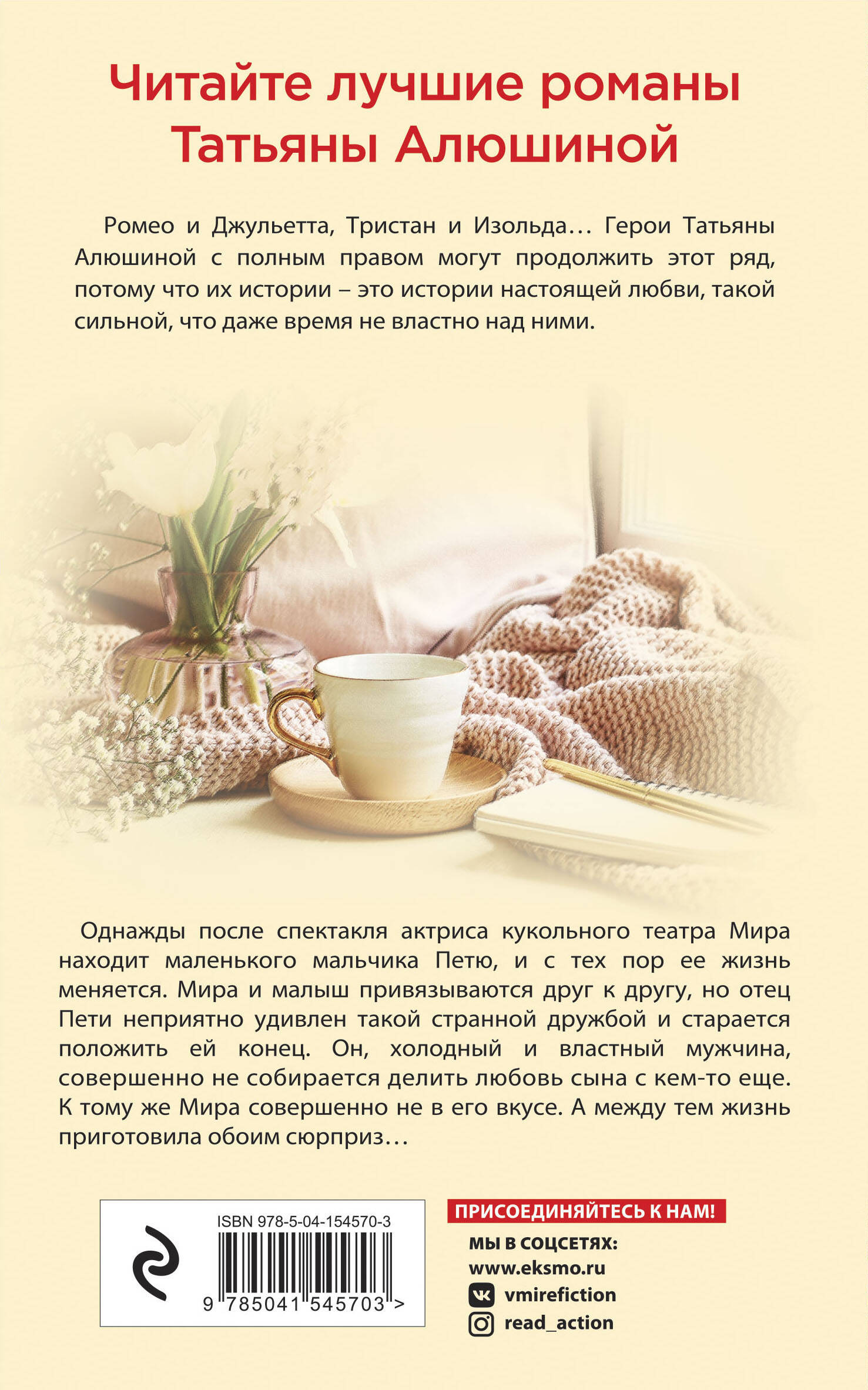 Романы Татьяны Алюшиной давно заслужили признание читательниц по всей стране, а суммарный тираж ее книг насчитывает более пяти миллионов! Захватывающие сюжеты, незабываемые чувства и подлинная страсть - ее книги читаются на одном дыхании и снова помогают поверить: счастье есть! Однажды после спектакля актриса кукольного театра Мира находит маленького мальчика Петю, и с тех пор ее жизнь меняется. Мира и малыш привязываются друг к другу, но отец Пети неприятно удивлен такой странной дружбой и старается положить ей конец. Он, холодный и властный мужчина, совершенно не собирается делить любовь сына с кем-то еще. К тому же Мира совершенно не в его вкусе. А между тем жизнь приготовила обоим сюрприз…| Издательство | ООО "Издательство "Эксмо" |