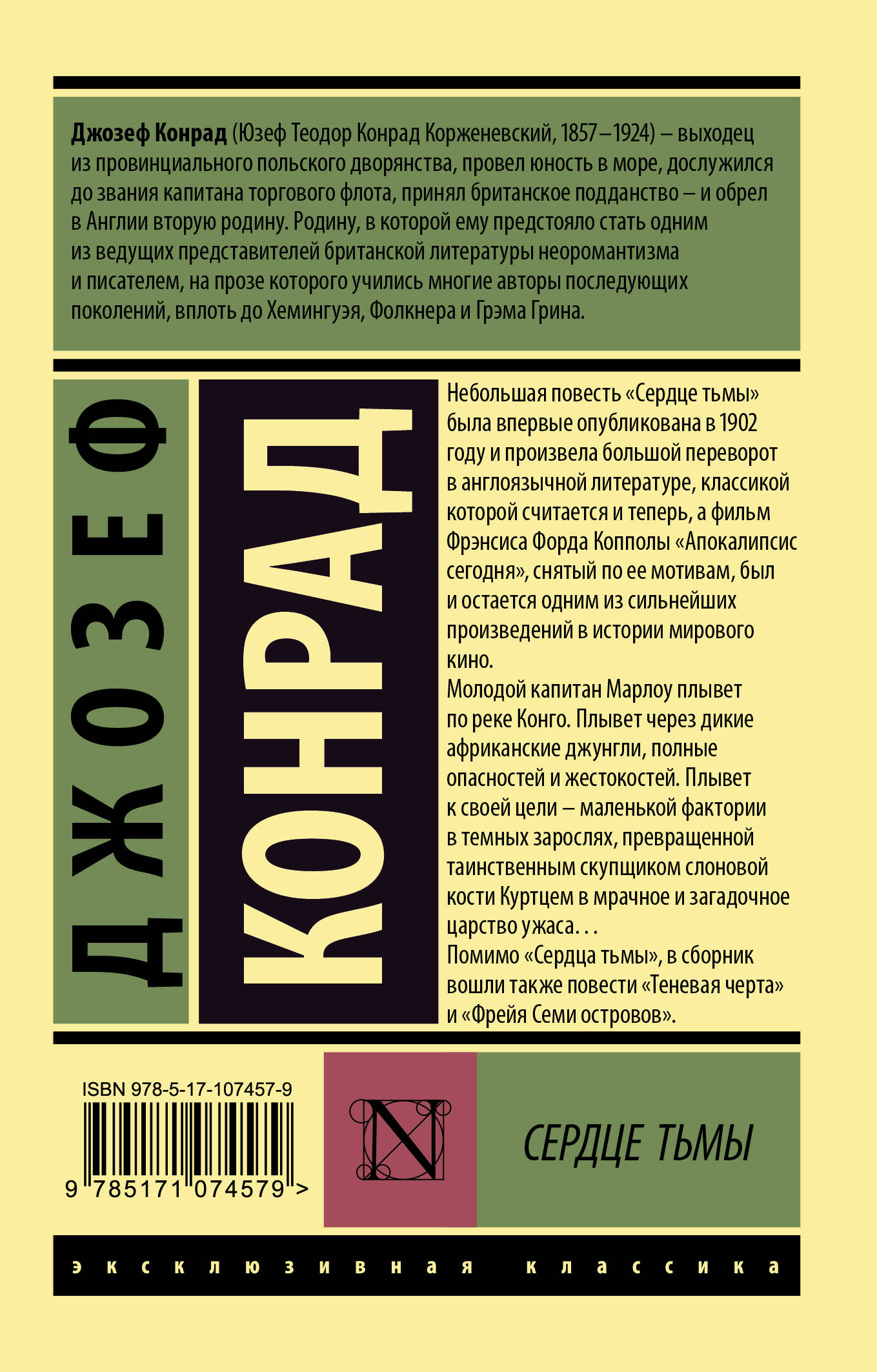 Небольшая повесть "Сердце тьмы" была впервые опубликована в 1902 году и произвела большой переворот в англоязычной литературе, классикой которой считается и теперь, а фильм Фрэнсиса Форда Копполы "Апокалипсис сегодня", снятый по ее мотивам, был и остается одним из самых сильнейших произведений в истории мирового кино. Молодой капитан Марлоу плывет по реке Конго. Плывет через дикие африканские джунгли, полные опасностей и жестокостей. Плывет к своей цели - маленькой фактории в темных зарослях, превращенной таинственным скупщиком слоновой кости Куртцем в мрачное и загадочное царство ужаса… Помимо "Сердца тьмы", в сборник вошли также повести "Теневая черта" и "Фрейя Семи островов".