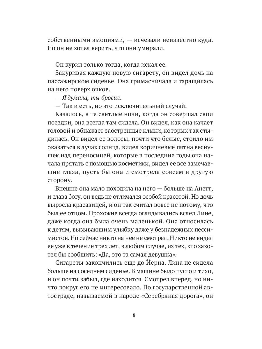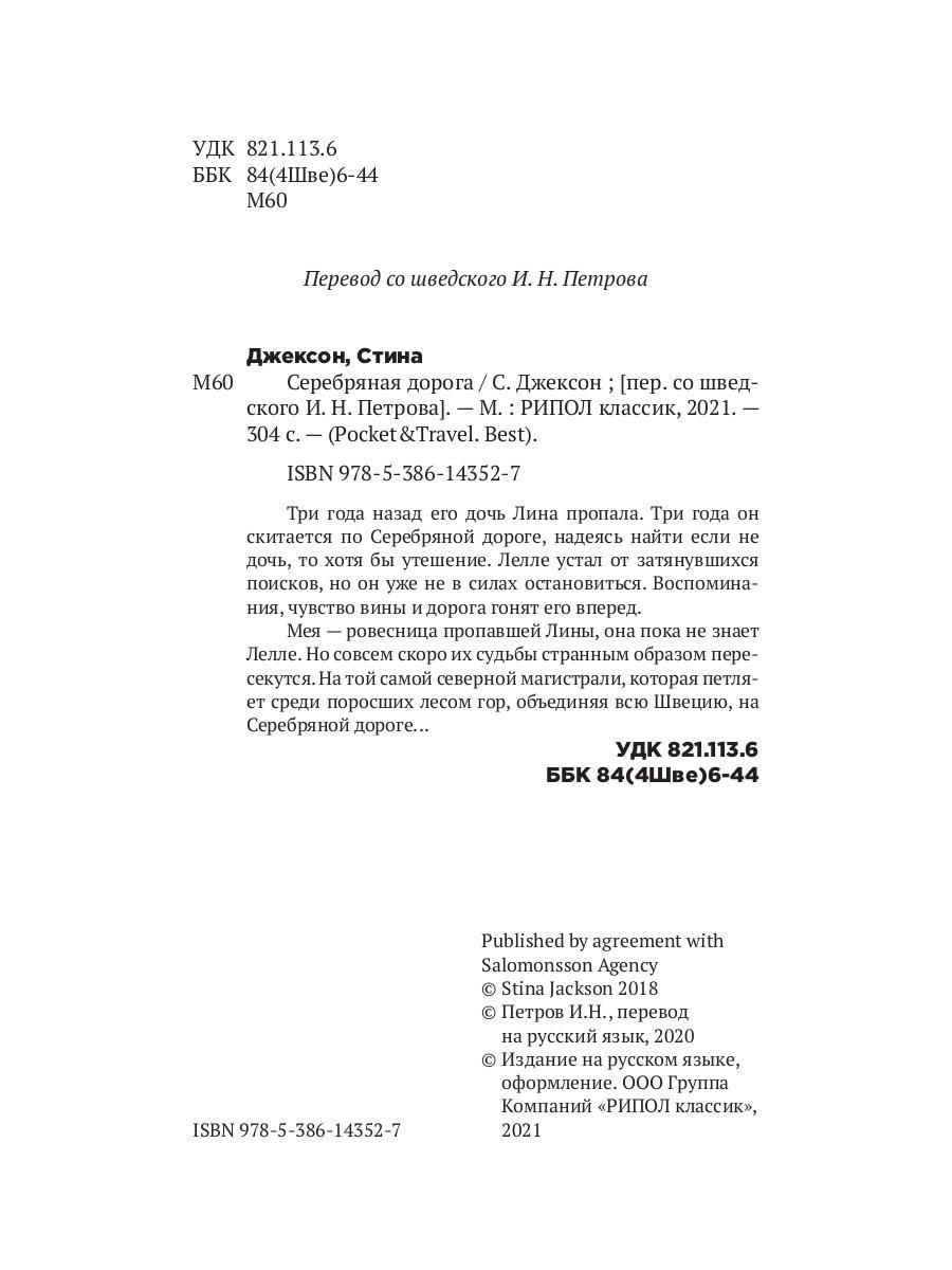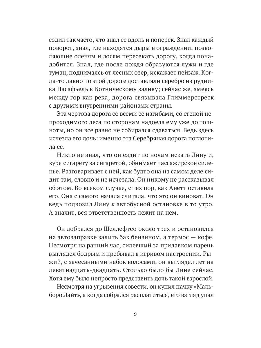 Три года назад его дочь Лина пропала. Три года он скитается по Серебряной дороге, надеясь найти если не дочь, то хотя бы утешение. Лелле устал от затянувшихся поисков, но он уже не в силах остановиться. Воспоминания, чувство вины и дорога гонят его вперед. Мея - ровесница пропавшей Лины, она пока не знает Лелле. Но совсем скоро их судьбы странным образом пересекутся. На той самой северной магистрали, которая петляет среди поросших лесом гор, объединяя всю Швецию, на Серебряной дороге...| Издательство | Рипол Классик |