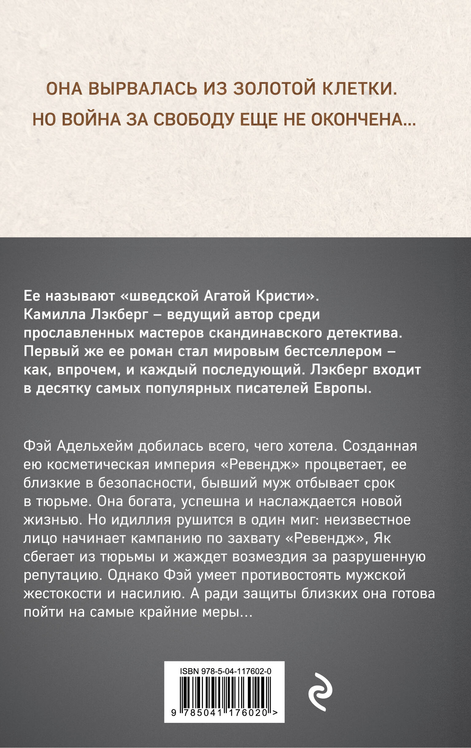 ПРОДОЛЖЕНИЕ НОВОГО ЛИТЕРАТУРНОГО ЦИКЛА КАМИЛЛЫ ЛЭКБЕРГ. 28 миллионов экземпляров книг в более чем 60 странах на более чем 30 языках. Она вырвалась из золотой клетки. Но война за свободу еще не окончена. Фэй Адельхейм добилась всего, чего хотела. Созданная ею косметическая империя «Ревендж» процветает, ее близкие в безопасности, бывший муж отбывает срок в тюрьме. Она богата, успешна и наслаждается новой жизнью. Но идиллия рушится в один миг: неизвестное лицо начинает кампанию по захвату «Ревендж», Як сбегает из тюрьмы и жаждет возмездия за разрушенную репутацию. Однако Фэй умеет противостоять мужской жестокости и насилию. А ради защиты близких она готова пойти на самые крайние меры… «Лэкберг особенно хороша в изображении клаустрофобии, свойственной маленьким сообществам, в которых все знают всех, а полицейский может дружить с убийцей». - The Times «От романов Лэкберг бросает то в жар, то в холод». - Sun «У Лэкберг особый дар: ей удалось создать два наиболее законченных образа во всей современной детективной литературе - причем сделать это с особой теплотой, пробивающейся сквозь скандинавскую холодность». - Independent «Лэкберг - эксперт в деле смешивания милых домашних сцен с останавливающим кровь ужасом». - Guardian| Издательство | ООО "Издательство "Эксмо" |