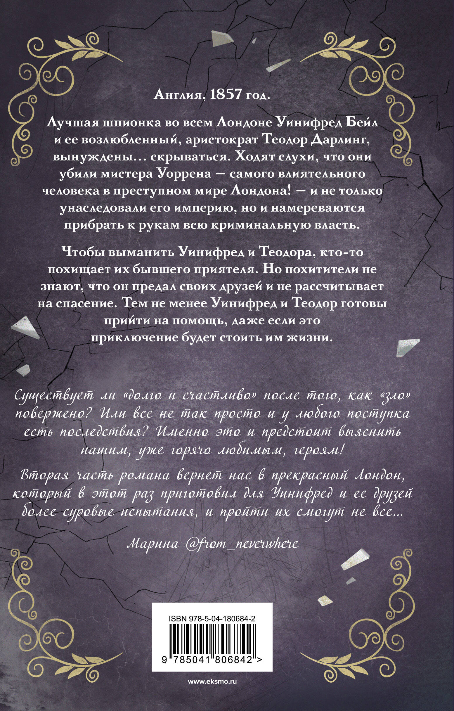 Англия, 1857 год. Лучшая шпионка во всем Лондоне Уинифред Бейл и ее возлюбленный, аристократ Теодор Дарлинг, вынуждены… скрываться. Ходят слухи, что они убили мистера Уоррена - самого влиятельного человека в преступном мире Лондона! - и не только унаследовали его империю, но и намереваются прибрать к рукам всю криминальную власть. Чтобы выманить Уинифред и Теодора, кто-то похищает их бывшего приятеля. Но похитители не знают, что он предал своих друзей и не рассчитывает на спасение. Тем не менее Уинифред и Теодор готовы прийти на помощь, даже если это приключение будет стоить им жизни. ------------------------------ «Существует ли "долго и счастливо", после того как "зло" повержено? Или все не так просто и у любого поступка есть последствия? Именно это и предстоит выяснить нашим, уже горячо любимым, героям! Вторая часть романа вернет нас в прекрасный Лондон, который в этот раз приготовил для Уинифред и ее друзей более суровые испытания, и пройти их смогут не все…» - Марина (@from_neverwhere)| Издательство | ООО "Издательство "Эксмо" |
