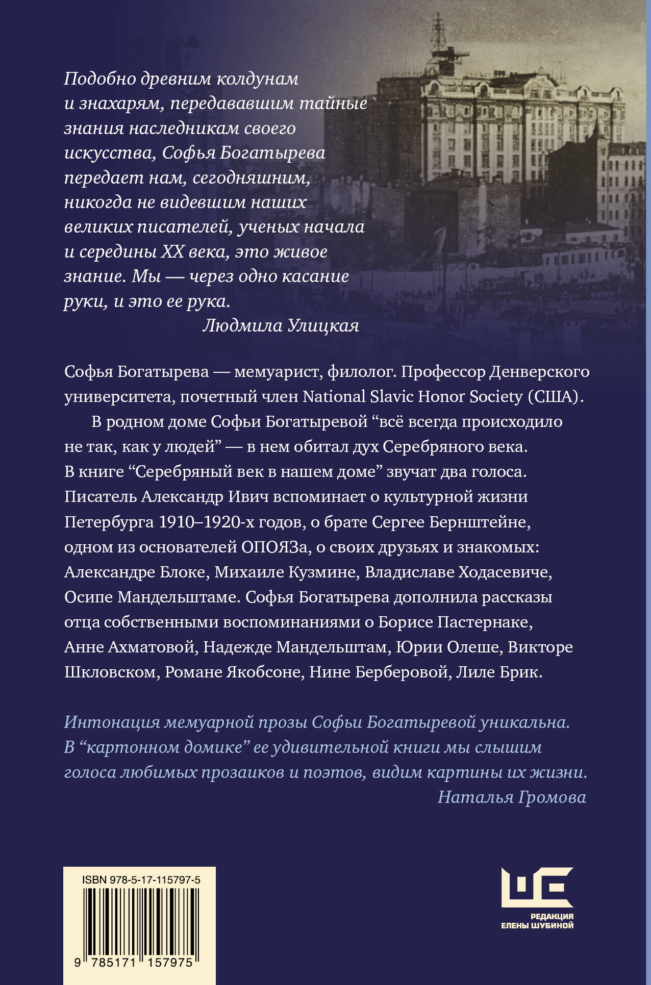 Софья Богатырева - мемуарист, филолог; профессор Денверского университета, почетный член National Slavic Honor Society (США). В родном доме Софьи Богатыревой "всё всегда происходило не так, как у людей" - в нем обитал дух Серебряного века. В книге "Серебряный век в нашем доме" звучат два голоса. Писатель Александр Ивич вспоминает о культурной жизни Петербурга 1910-1920-х годов, о брате Сергее Бернштейне, одном из основателей ОПОЯЗа, о своих друзьях и знакомых: Александре Блоке, Михаиле Кузмине, Владиславе Ходасевиче, Осипе Мандельштаме. Софья Богатырева дополнила рассказы отца собственными воспоминаниями о Борисе Пастернаке, Анне Ахматовой, Надежде Мандельштам, Юрии Олеше, Викторе Шкловском, Романе Якобсоне, Нине Берберовой, Лиле Брик.| Издательство | ИЗДАТЕЛЬСТВО "АСТ" |