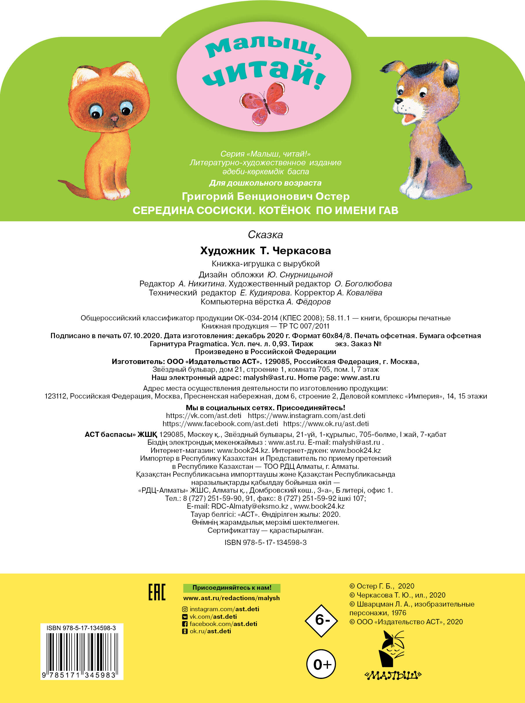 Почему сосиски такие вкусные и почему они так быстро заканчиваются, пытались разобраться котёнок по имени Гав и его лучший друг Щенок. Но разобраться не успели, потому что… сосиска закончилась! Эту забавную историю придумал Григорий Остер - знаменитый детский писатель, а картинки к ней нарисовал художник-мультипликатор Борис Акулиничев.| Издательство | ИЗДАТЕЛЬСТВО "АСТ" |