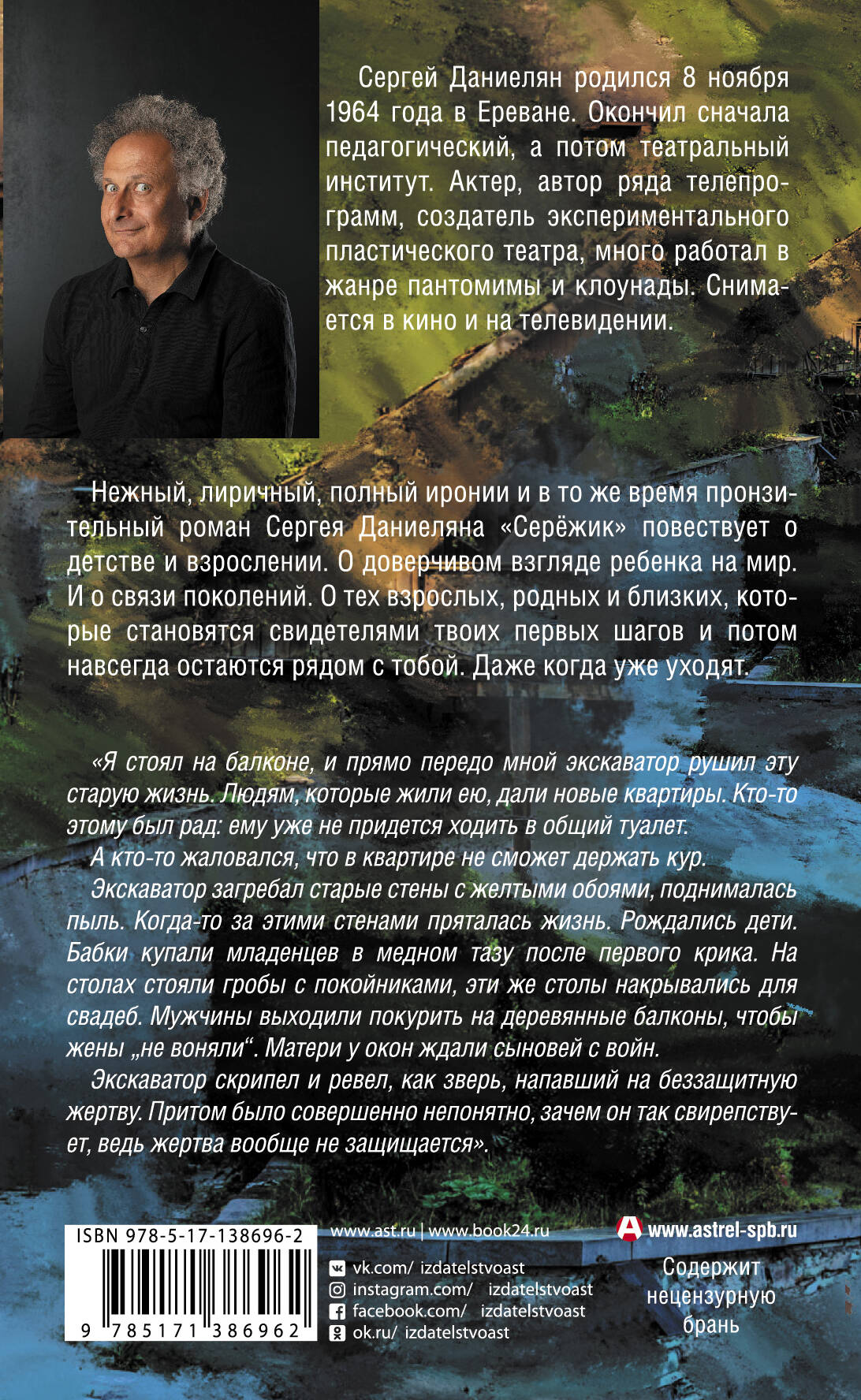 Нежный, лиричный, полный иронии и в то же время пронзительный роман Сергея Даниеляна "Серёжик" повествует о детстве и взрослении. О доверчивом взгляде ребенка на мир. И о связи поколений. О тех взрослых, родных и близких, которые становятся свидетелями твоих первых шагов и потом навсегда остаются рядом с тобой. Даже когда уже уходят.| Издательство | ИЗДАТЕЛЬСТВО "АСТ" |