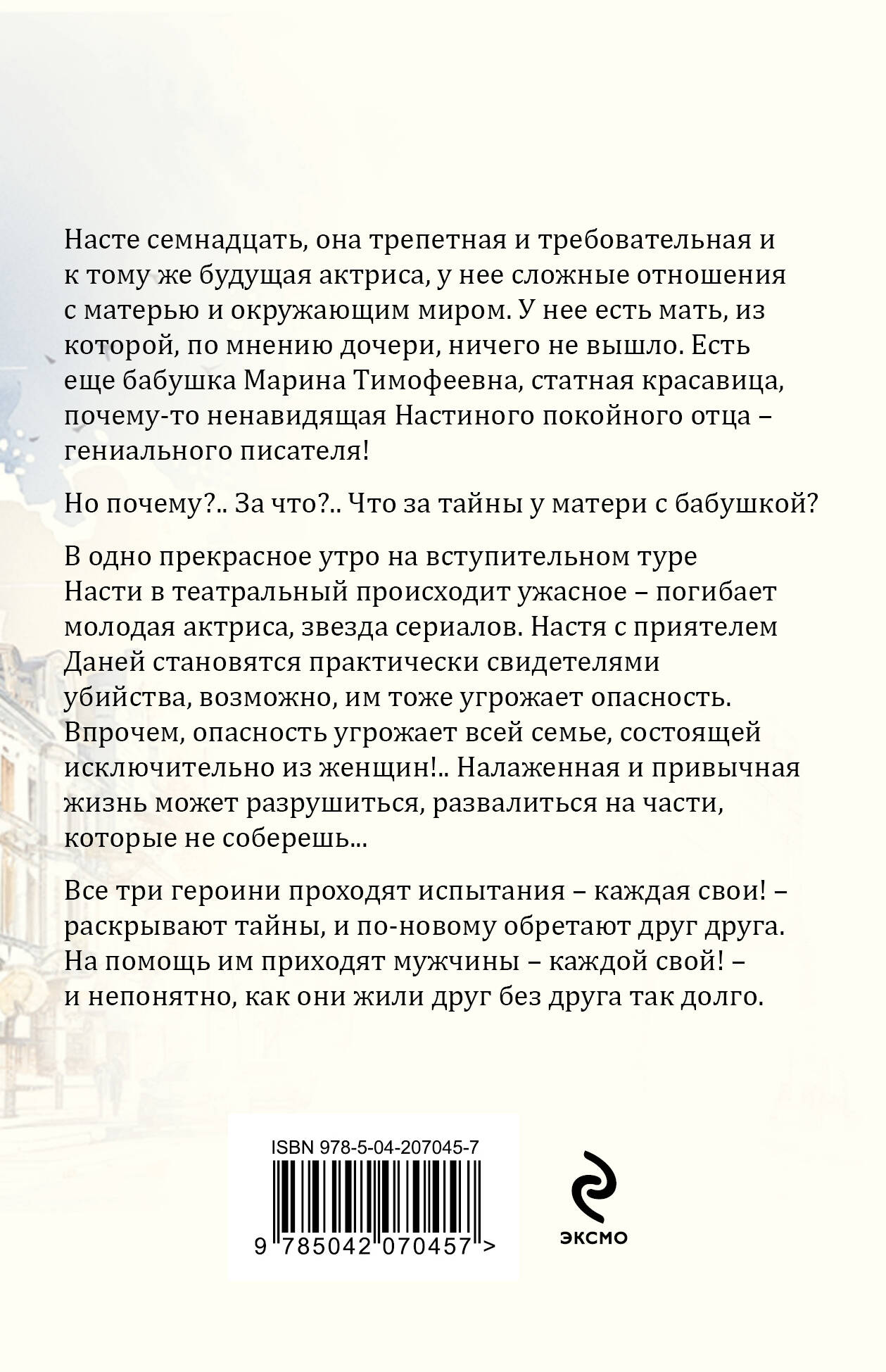 Насте семнадцать, она трепетная и требовательная, и к тому же будущая актриса, у нее сложные отношения с матерью и окружающим миром. У нее есть мать, из которой, по мнению дочери, ничего не вышло. Есть еще бабушка Марина Тимофеевна, статная красавица, почему-то ненавидящая Настиного покойного отца - гениального писателя! Но почему?.. За что?.. Что за тайны у матери с бабушкой? В одно прекрасное утро на вступительном туре Насти в театральный происходит ужасное - погибает молодая актриса, звезда сериалов. Настя с приятелем Даней становятся практически свидетелями убийства, возможно, им тоже угрожает опасность. Впрочем, опасность угрожает всей семье, состоящей исключительно из женщин!.. Налаженная и привычная жизнь может разрушиться, развалиться на части, которые не соберешь... Все три героини проходят испытания - каждая свои! - раскрывают тайны и по-новому обретают друг друга. На помощь им приходят мужчины - каждой свой! - и непонятно, как они жили друг без друга так долго. Татьяна Устинова - один из топовых авторов современной российской прозы, обладатель двух премий «Электронная буква», лауреат «ТЭФИ» в номинации «Сценарист телевизионного фильма». «Первая среди лучших» - так называют Татьяну Витальевну, и это не просто остроумный эпитет, а звание, подтвержденное десятками написанных романов, успешными экранизациями и, конечно, любовью многочисленных поклонников ее творчества.