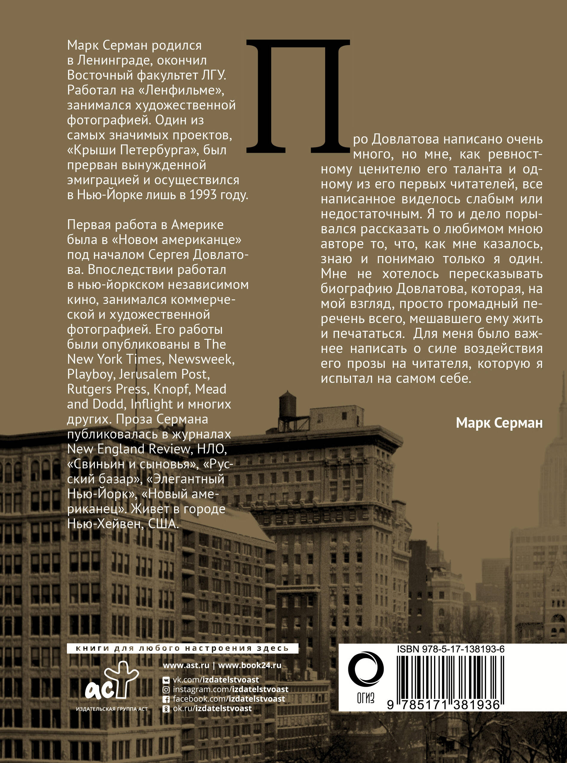 Про Довлатова написано очень много, но мне, как ревностному ценителю его таланта и одному из его первых читателей, все написанное виделось слабым или недостаточным. Я то и дело порывался рассказать о любимом мною авторе то, что, как мне казалось, знаю и понимаю только я один. Мне не хотелось пересказывать биографию Довлатова, которая, на мой взгляд, просто громадный перечень всего, мешавшего ему жить и печататься. Для меня было важнее написать о силе воздействия его прозы на читателя, которую я испытал на самом себе. Марк Серман Издание подготовлено к 80-летнему юбилею Сергея Довлатова.| Издательство | ИЗДАТЕЛЬСТВО "АСТ" |