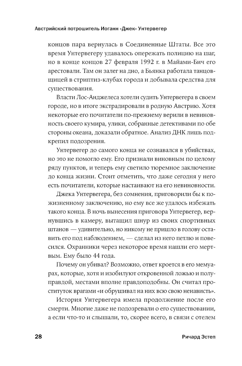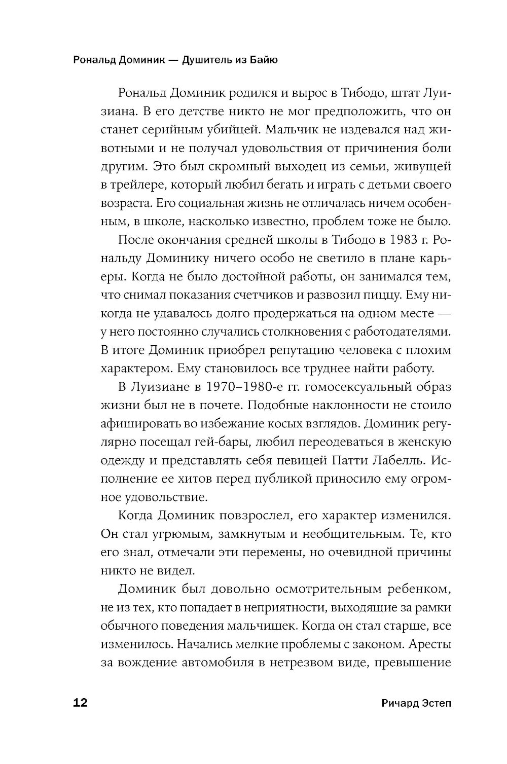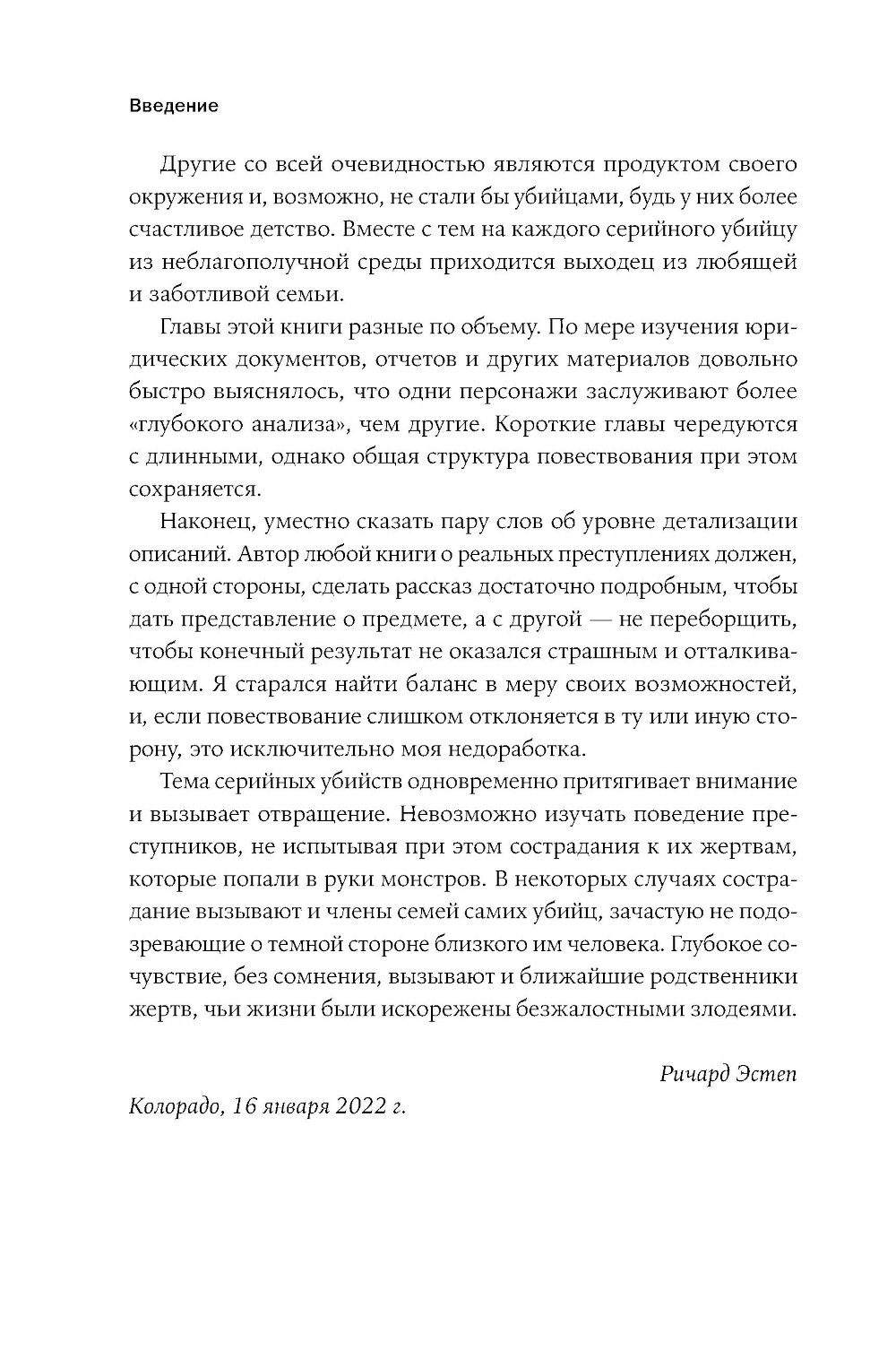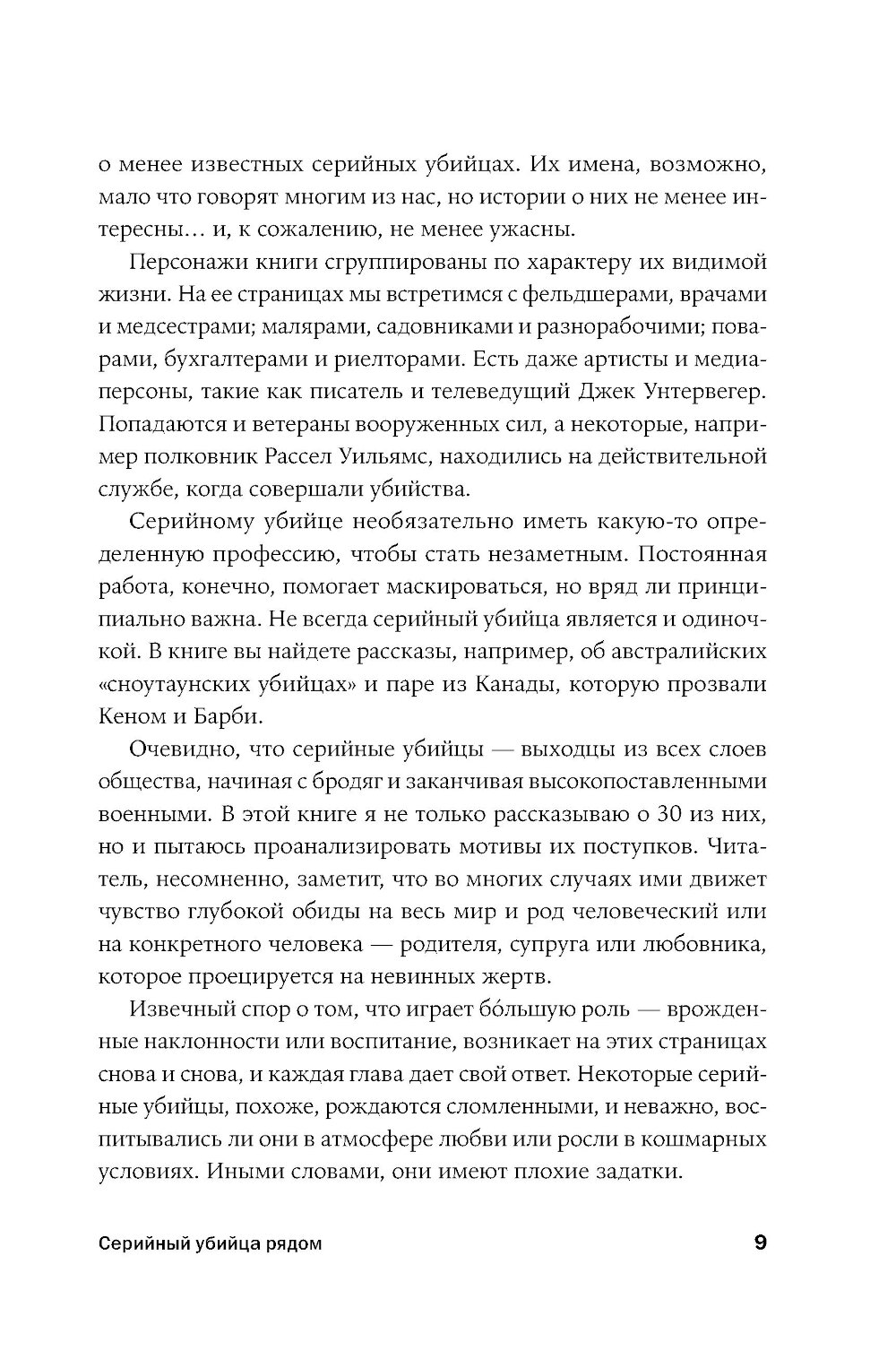 Вы хорошо знаете своих соседей? Наверняка вы даже не догадываетесь, что они делают за закрытыми дверями. В своей книге писатель и телеведущий Ричард Эстеп описывает истории 30 серийных убийц, жизнь которых на первый взгляд ничем не отличалась от нашей. Эти жестокие преступники - риелторы, полицейские, врачи, садовники - маскировались так хорошо, что годами не вызывали подозрений у близких. В каждой главе он описывает историю, анализирует мотивы и рисует психологически достоверный портрет одного серийного убийцы. Точно и профессионально, с леденящими душу подробностями автор рассказывает, как медсестра Дженин Джонс, милиционер Михаил Попков или пилот Национальной гвардии США Роберт Ли Йейтс годами избегали наказания и какие ужасы скрывались за фасадом их респектабельной и даже скучной жизни.