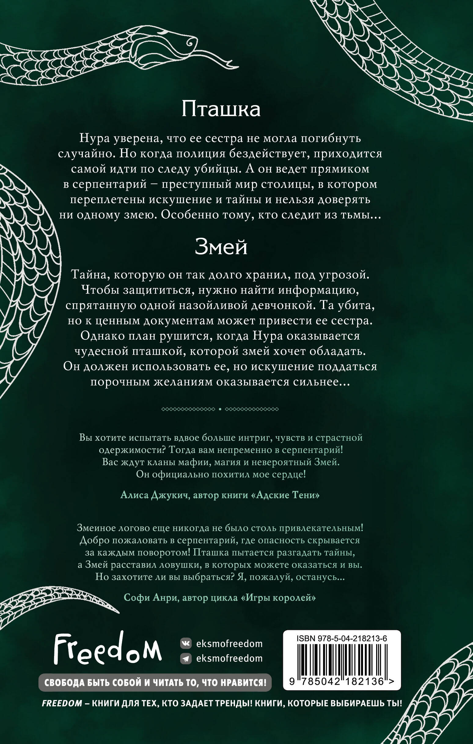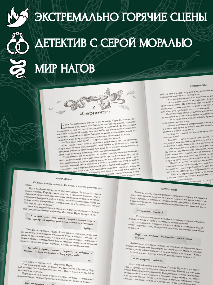 Одиночное дарк-фэнтези от автора «Аконита» Ирены Мадир! Книга, которую можно читать как самостоятельную историю из мира Шарана! Внутри книги вас ждут: герои с серой моралью, сталкер, детективное расследование, наги и горячие любовные сцены, от которых ваше сердце вспыхнет, словно спичка! Главная героиня погружается в опасный преступный мир змеиных кланов, чтобы разгадать тайну гибели своей сестры. Однако эта Пташка не знает, что самый опасный Змей серпентария уже проник в ее дом, а скоро поселится и в ее сердце… В оформлении использованы цветной форзац и цветные вклейки-комикс, которые автор отрисовала сама! Если вам понравилась книга «Преследуя Аделин» Х. Д. Карлтон, то попробуйте и «Серпентарий». Этот сталкер точно украдет ваше сердечко!| Издательство | ООО "Издательство "Эксмо" |