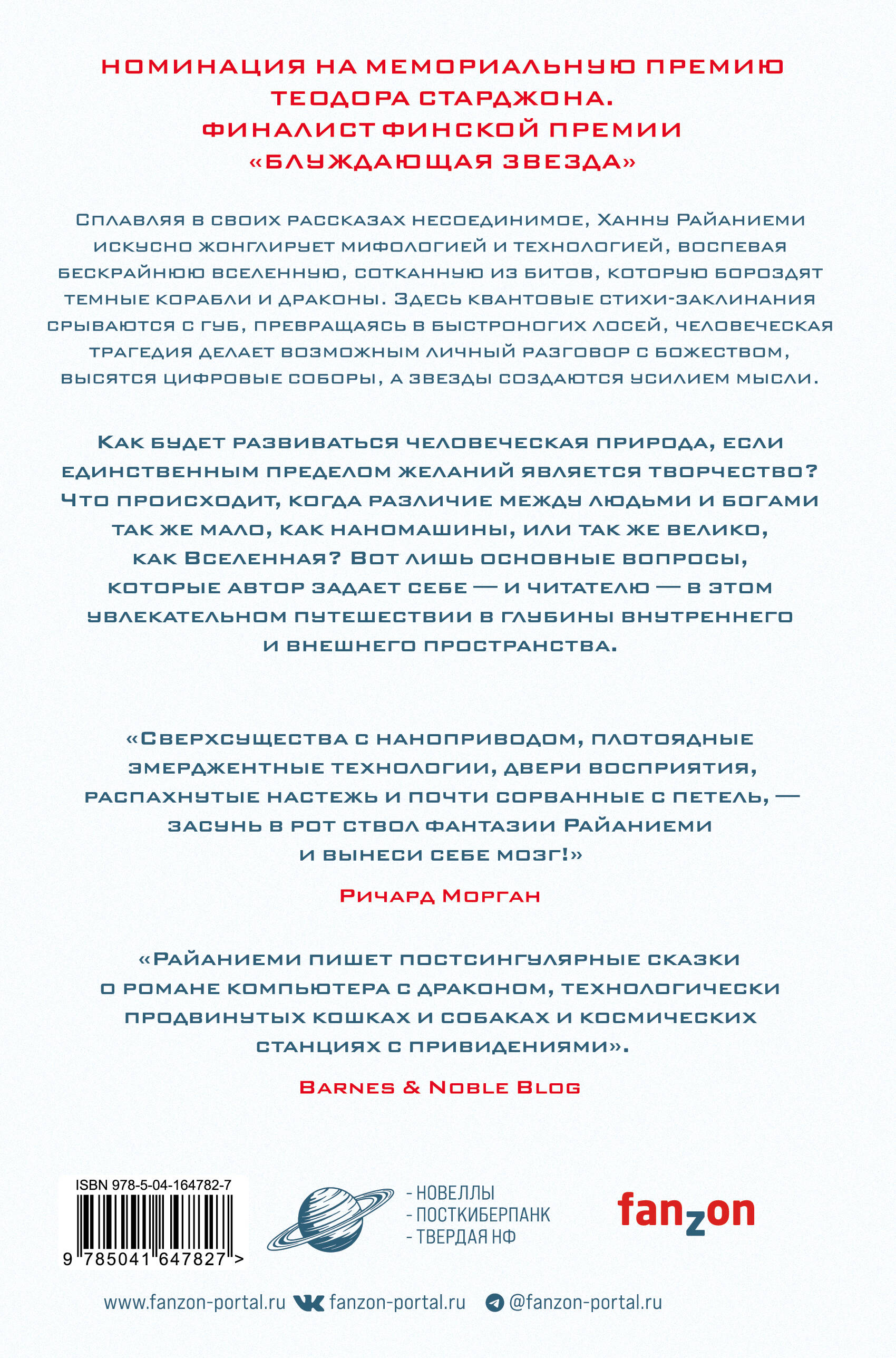 Номинация на Мемориальную премию Теодора Старджона. Финалист финской премии «Блуждающая звезда». Финалист премий «Локус» и «Хьюго». Сплавляя в своих рассказах несоединимое, Ханну Райаниеми искусно жонглирует мифологией и технологией, воспевая бескрайнюю вселенную, сотканную из битов, которую бороздят темные корабли и драконы. Здесь квантовые стихи-заклинания срываются с губ, превращаясь в быстроногих лосей, человеческая трагедия делает возможным личный разговор с божеством, высятся цифровые соборы, а звезды создаются усилием мысли. Как будет развиваться человеческая природа, если единственным пределом желаний является творчество? Что происходит, когда различие между людьми и богами так же мало, как наномашины, или так же велико, как Вселенная? Вот лишь основные вопросы, которые автор задает себе - и читателю - в этом увлекательном путешествии в глубины внутреннего и внешнего пространства. «Райаниеми, без сомнения, один из умнейших писателей, работающих в жанре научной фантастики». - Tor.com «Актуальная демонстрация того, как научная фантастика расширяет возможности литературы и опыт человека». - Geek Chocolate «Сверхсущества с наноприводом, плотоядные эмерджентные технологии, двери восприятия, распахнутые настежь и почти сорванные с петель - засунь в рот ствол фантазии Райаниеми и вынеси себе мозг!» - Ричард Морган «Как в реальности, так и в вымысле, Райаниеми находится на самом переднем крае». - Interzone «Маленькие жемчужины высококонцептуальной прозы». - Sci-Fi and fantasy Reviews «Эта книга не для ваших дедушек. Эта книга не для фанатов "Звездных Войн". Эта книга не для тех, кто "просто почитывает" НФ. Но если вы читали Грега Игана, Чарльза Стросса, Ричарда Моргана, Дэниэла Суареза и Вернора Винджа - хватайте ее как можно скорее». - The Daily «Вихрь, в котором встречаются наука и странности будущего, взрывающийся фейерверком смелых идей, комплексным нарративом и чертовски хорошей прозой». - My Biochemical Sky «Лучшая и самая оригинальная антология после "Фейерверка" Анджелы Картер, вышедшего 40 лет назад». - Wall Street Journal «Это восхитительное путешествие в воображаемые миры привносит свежий взгляд на вечные идеи». - Publishers Weekly «Райаниеми пишет постсингулярные сказки о романе компьютера с драконом, технологически продвинутых кошках и собаках и космических станциях с привидениями. Если вам нравится научная фантастика, а научная часть немного диковинна, то эта книга определенно для вас». - Barnes & Noble Blog| Издательство | ООО "Издательство "Эксмо" |