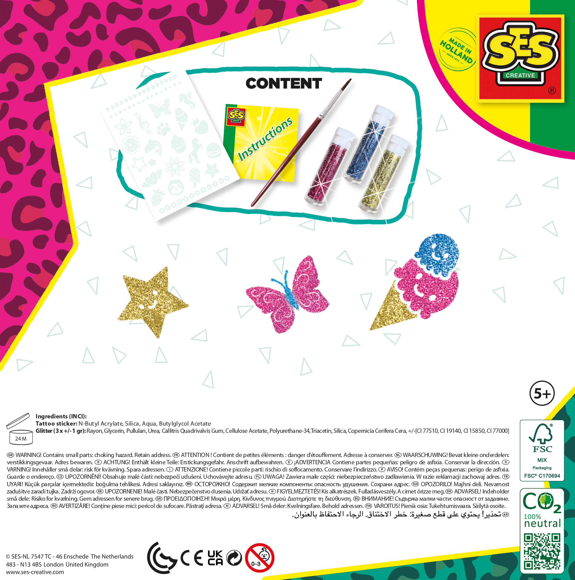 Сделайте свои собственные модные блестящие татуировки с помощью этого набора от SES Creative. Наклейте двусторонние прозрачные наклейки на кожу и нанесите кистью блестки на липкую часть. Сделайте свои татуировки уникальными, экспериментируя с разными цветами блесток или даже попробуйте смешать блестки. Дерматологически протестированы, легко смываются с кожи.