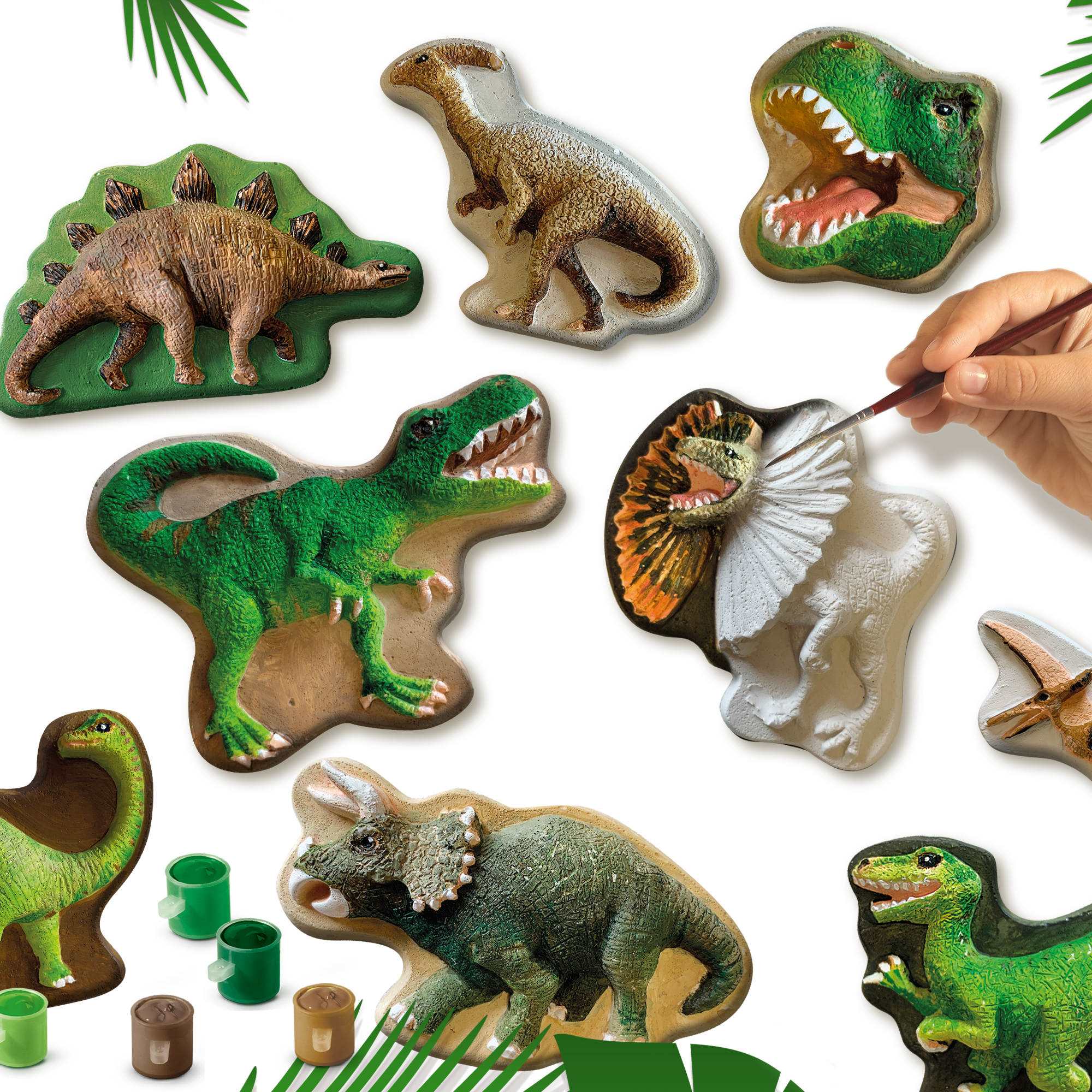 Этот набор создан специально для всех любителей динозавров! Вы можете легко создать девять разных динозавров, смешав гипсовый порошок с водой и залив его в форму. Как только гипс затвердеет, вы можете начать раскрашивать динозавра в шесть разных цветов. Вы начнете с T-Rex'а, Stegosaurus'a или, возможно, Triceratops'a? Раскрась их всех, и твой мир динозавров будет завершен!