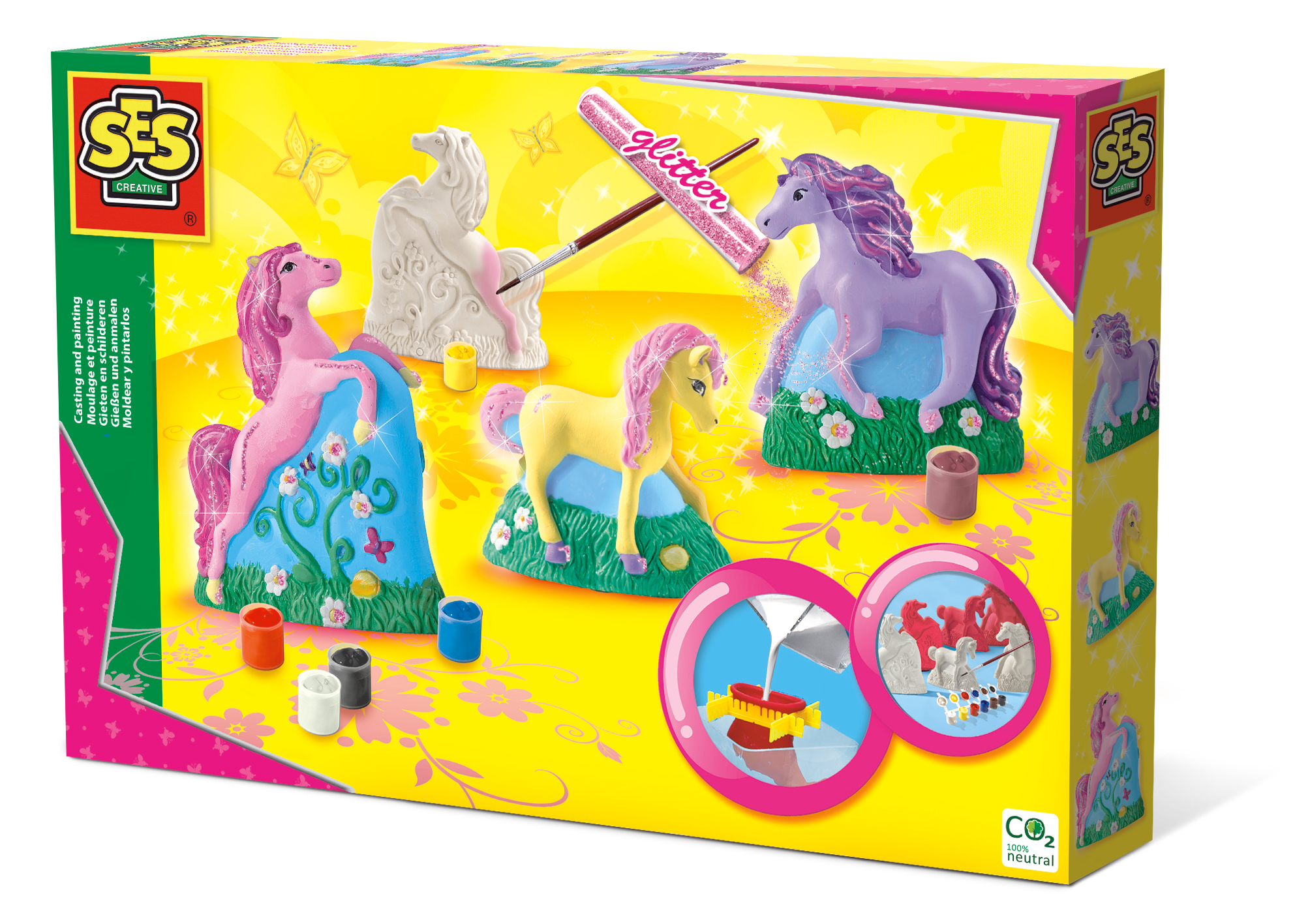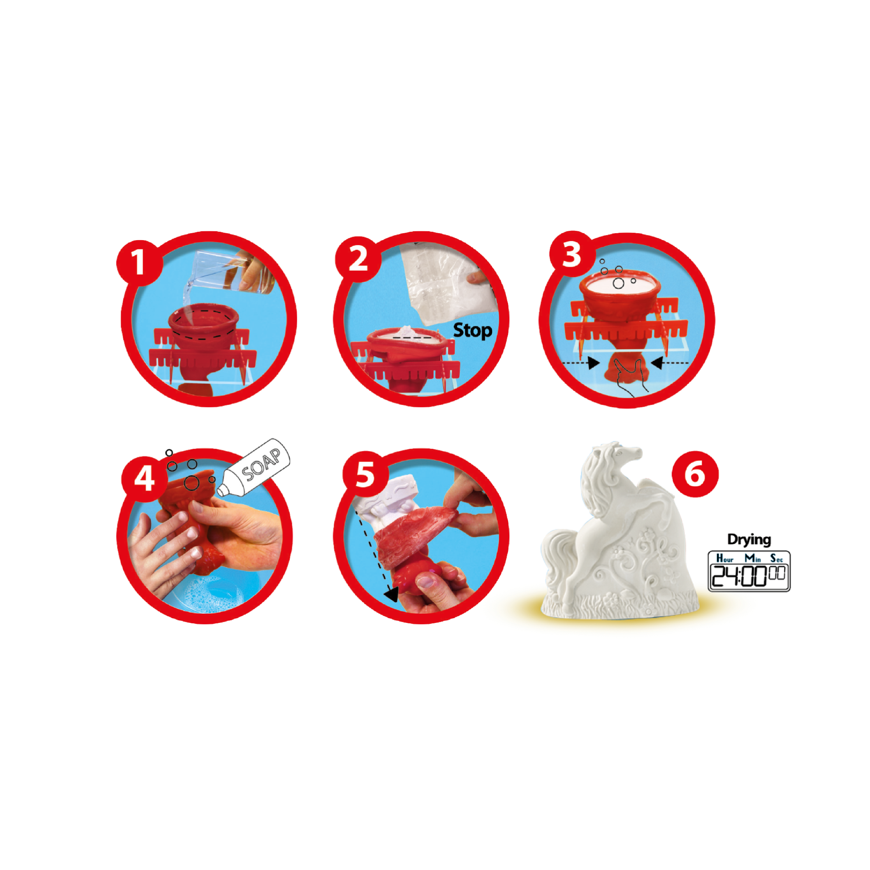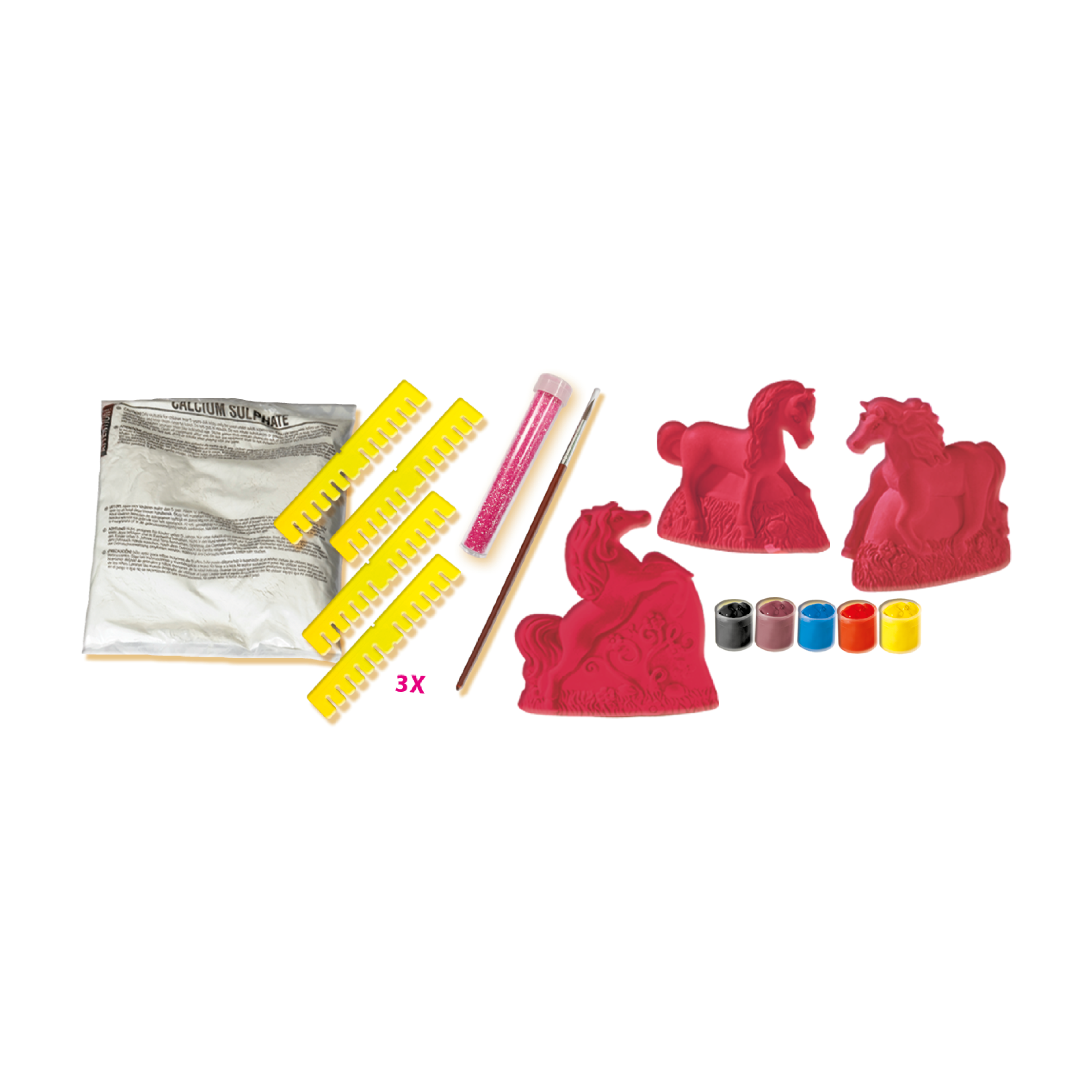 Ваши собственные модели лошадей из гипса! Залейте гипс в разные 3D-формы: жеребенка, стоящей лошади и вздыбленной лошади. Дайте моделям высохнуть и раскрасьте их краской из набора.