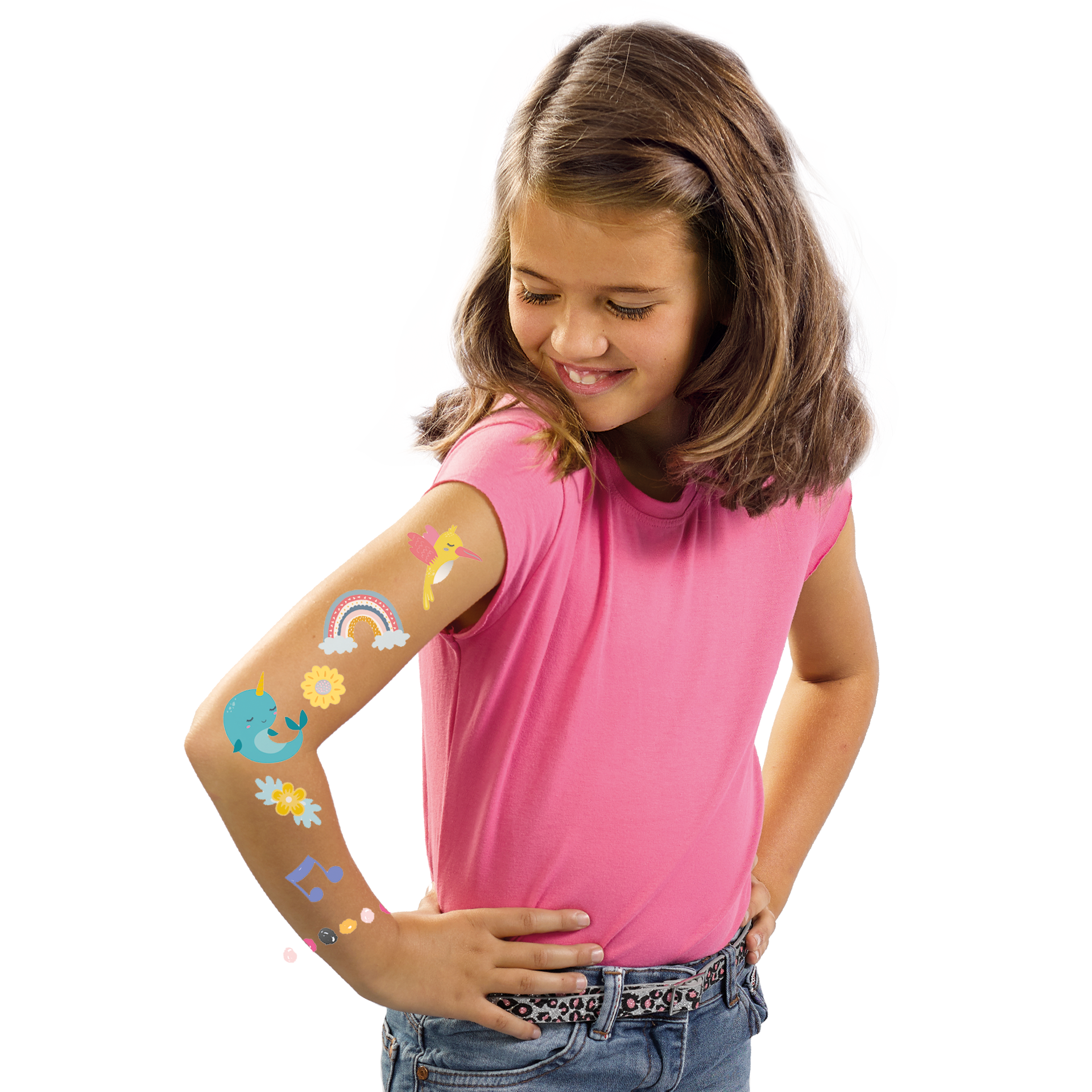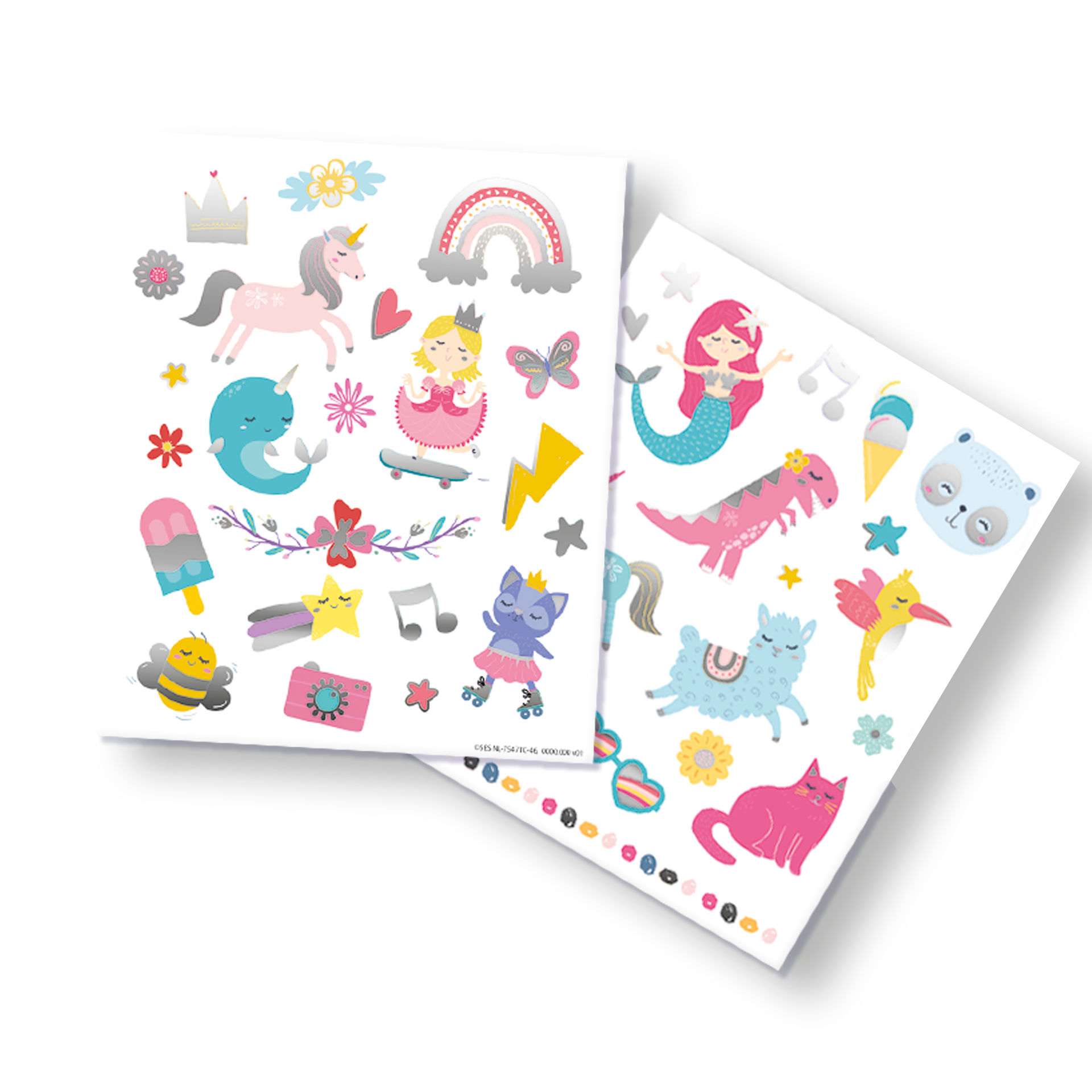 В этом наборе целых 40 тату с веселыми фигурками. Татуировки с металлическим эффектом легко наносятся и так же легко смываются с кожи.