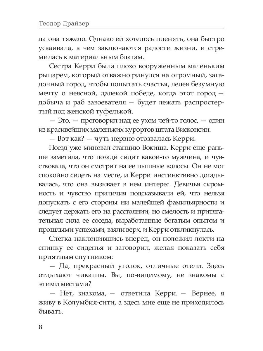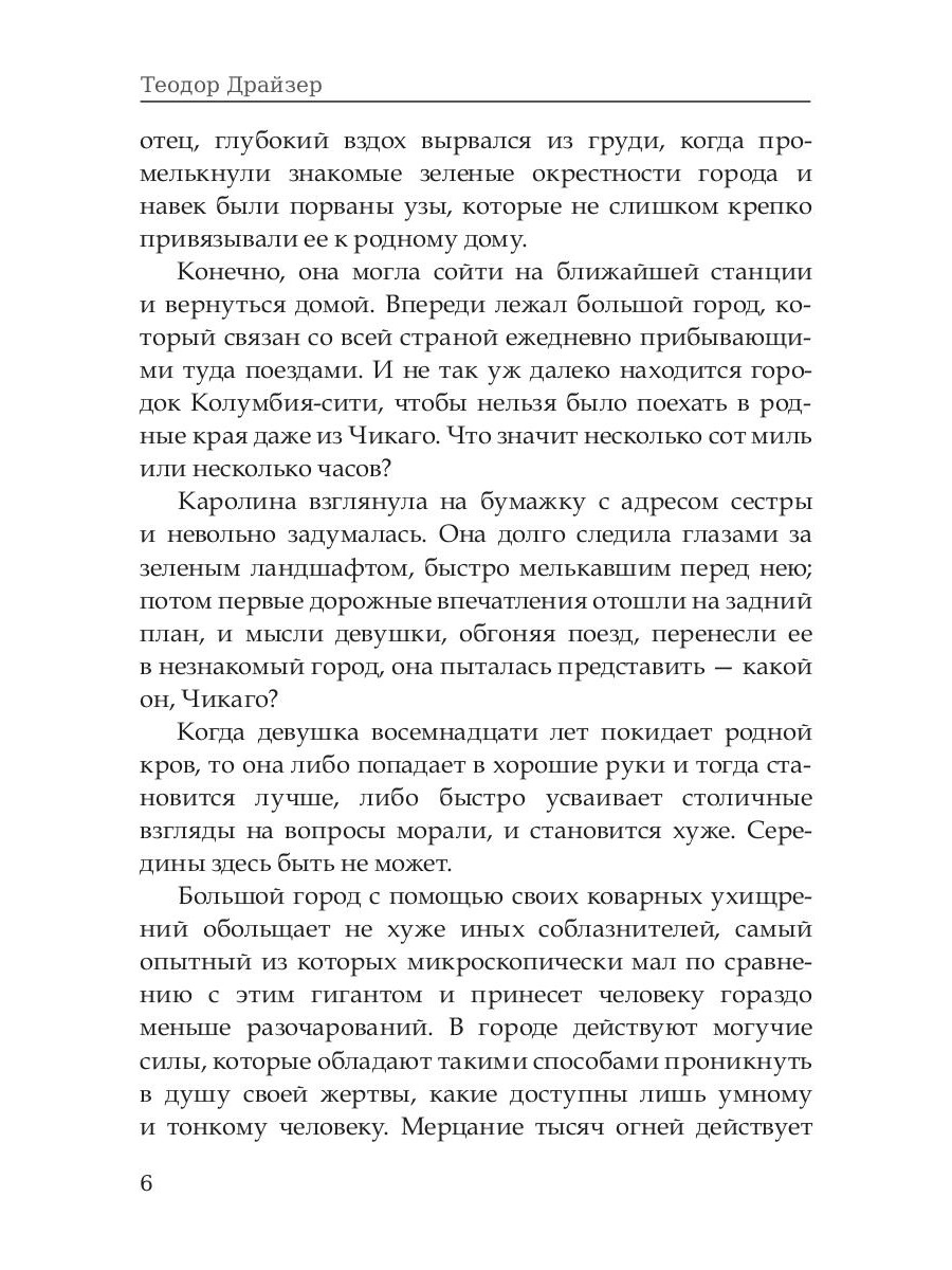 Восемнадцатилетняя Каролина, которую все называют Керри, приезжает из маленького городка к родственникам в Чикаго. Девушка полна радужных мечтаний и надежд, но поиски счастья в большом городе сбивают девушку с истинного пути. Опубликованное в 1900 году, произведение вызвало негодование критиков, назвавших его совершенно безнравственным.