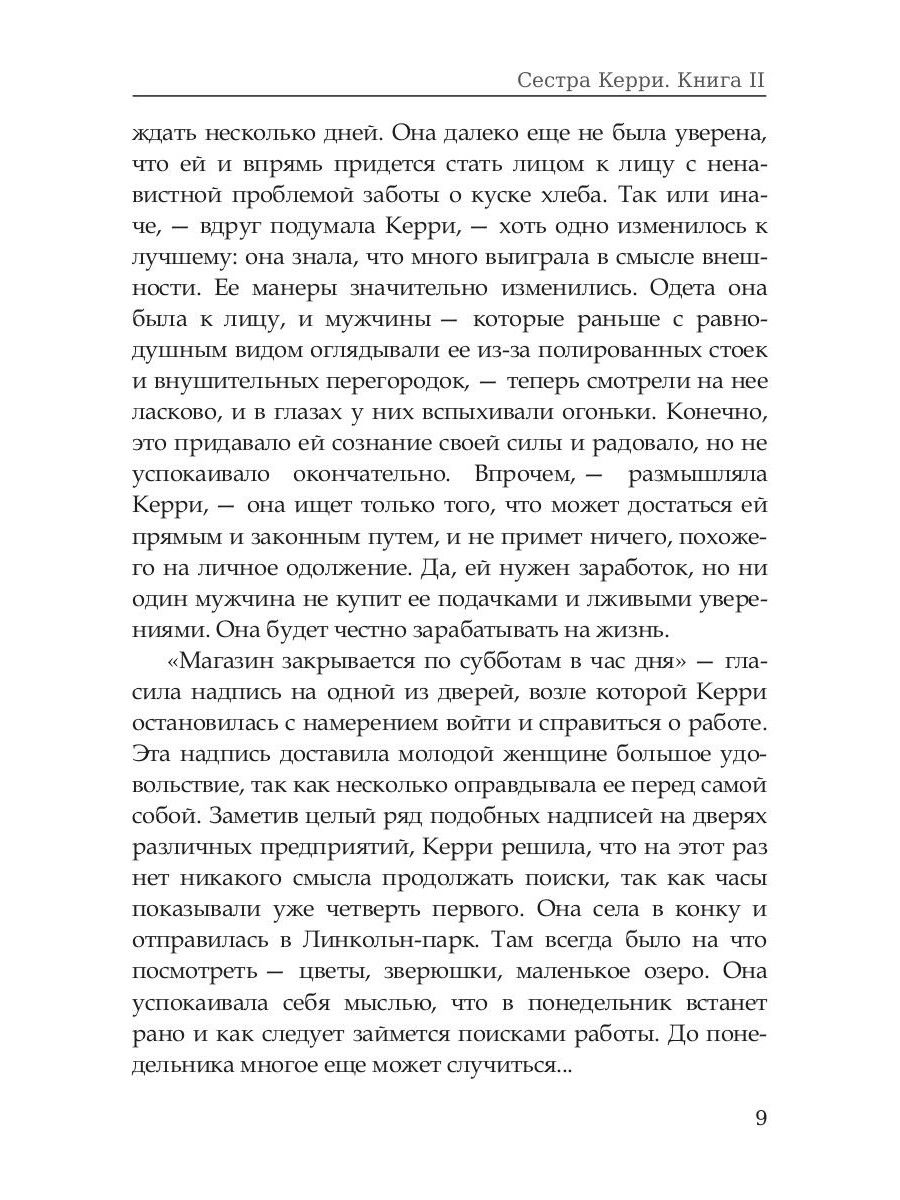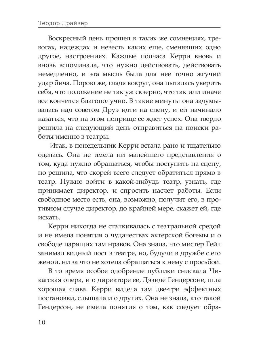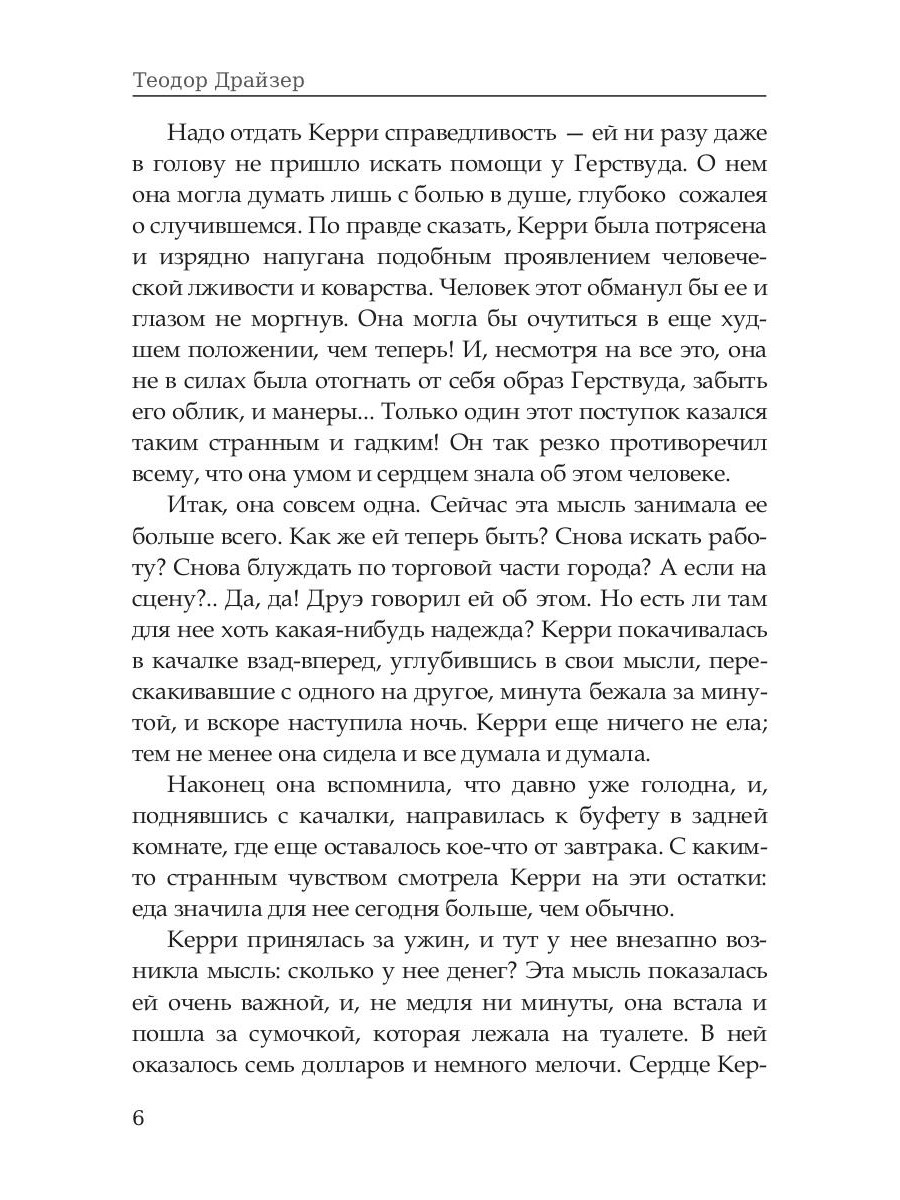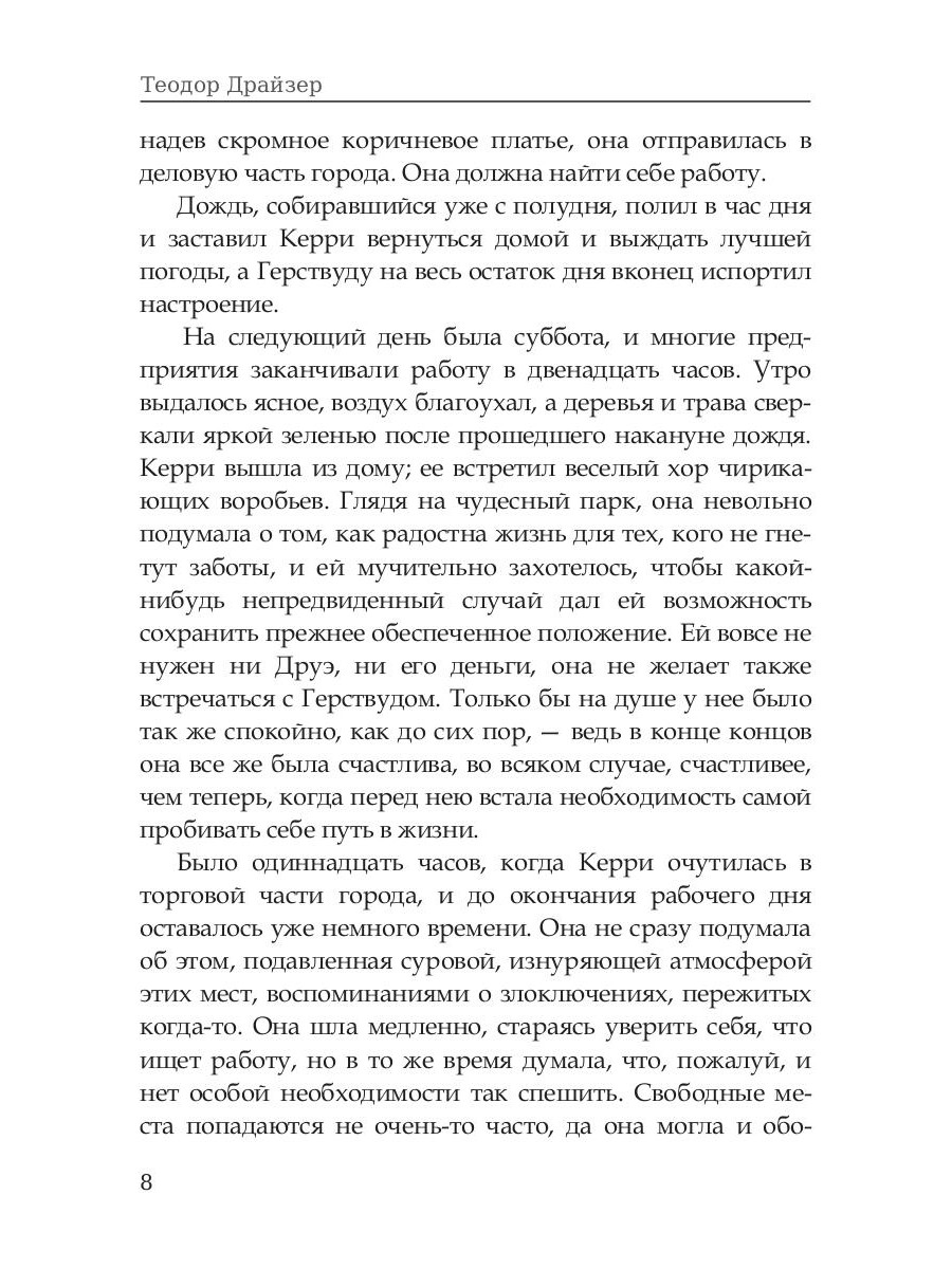 Восемнадцатилетняя Каролина, которую все называют Керри, приезжает из маленького городка к родственникам в Чикаго. Девушка полна радужных мечтаний и надежд, но поиски счастья в большом городе сбивают девушку с истинного пути. Опубликованное в 1900 году, произведение вызвало негодование критиков, назвавших его совершенно безнравственным.