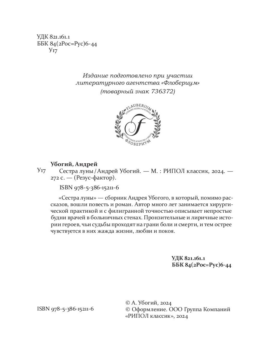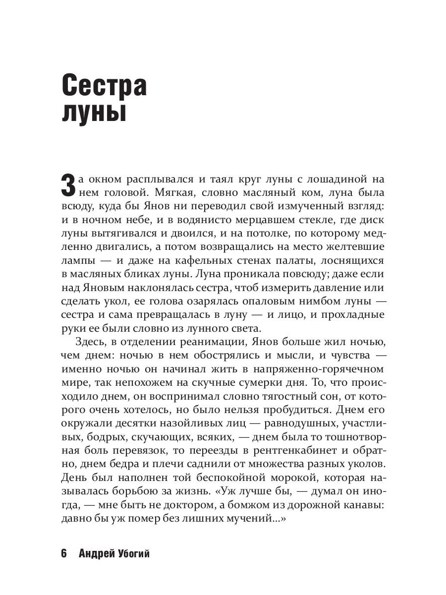 «Сестра луны» - сборник Андрея Убогого, в который, помимо рассказов, вошли повесть и роман. Автор много лет занимается хирургической практикой и с филигранной точностью описывает непростые будни врачей в больничных стенах. Пронзительные и лиричные истории героев, чьи судьбы проходят на грани боли и смерти, и тем острее чувствуется в них жажда жизни, любви и покоя.| Издательство | Рипол Классик |