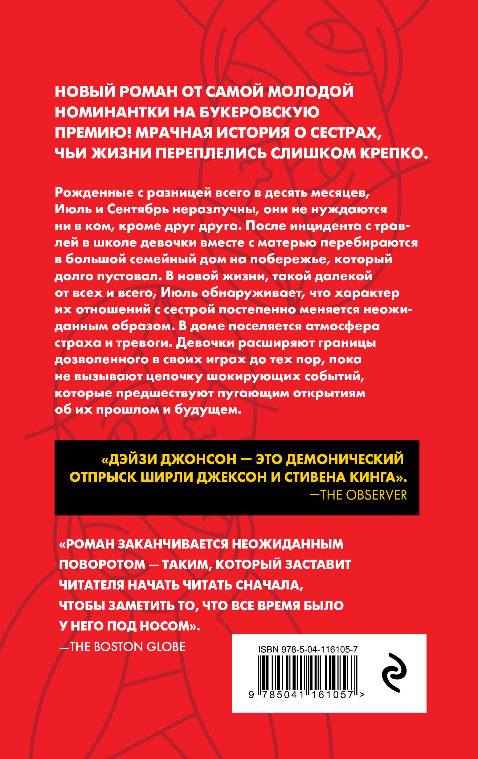 Новый роман от автора «В самой глубине» и самой молодой номинантки на Букеровскую премию! Мрачная история о сестрах, чьи жизни переплелись слишком крепко. Рожденные с разницей всего в десять месяцев, Июль и Сентябрь неразлучны, они не нуждаются ни в ком, кроме друг друга. После инцидента с травлей в школе девочки вместе с матерью перебираются в большой семейный дом на побережье, который долго пустовал. В новой жизни, такой далекой от всех и всего, Июль обнаруживает, что характер их отношений с сестрой меняется постепенно неожиданным образом. В доме поселяется атмосфера страха и тревоги. Девочки расширяют границы дозволенного в своих играх до тех пор, пока не вызывают цепочку шокирующих событий, которые предшествуют пугающим открытиям об их прошлом и будущем. «Дэйзи Джонсон - это демонический отпрыск Ширли Джексон и Стивена Кинга». -The Observer «Роман заканчивается неожиданным поворотом - таким, который заставит читателя начать читать с начала, чтобы заметить то, что все время было у него под носом». -The Boston Globe| Издательство | ООО "Издательство "Эксмо" |