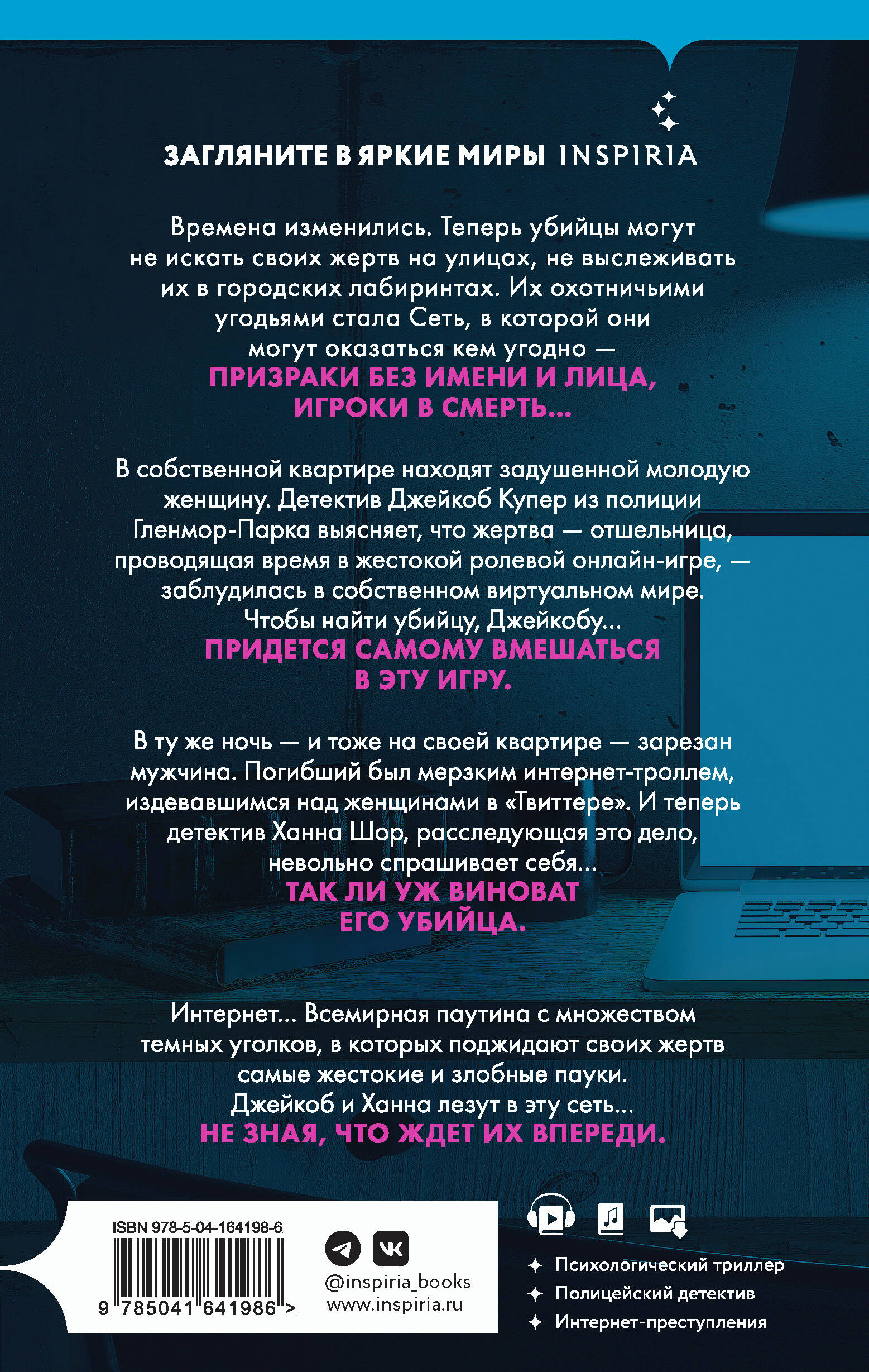 ПРЕДЫСТОРИЯ СУПЕРБЕСТСЕЛЛЕРА «ВНУТРИ УБИЙЦЫ». ВТОРОЙ РОМАН ИЗ ЦИКЛА «ГЛЕНМОР-ПАРК». Времена изменились. Теперь убийцы могут не искать своих жертв на улицах, не выслеживать их в городских лабиринтах. Их охотничьими угодьями стала Сеть, в которой они могут оказаться кем угодно. Призраки без имени и лица, игроки в смерть… В собственной квартире находят задушенной молодую женщину. Детектив Джейкоб Купер из полиции Гленмор-Парка выясняет, что жертва, отшельница, проводящая время в жестокой ролевой онлайн-игре, заблудилась в собственном виртуальном мире. Чтобы найти убийцу, Джейкобу придется самому вступить в эту игру… В ту же ночь - и тоже на своей квартире - зарезан мужчина. Погибший был мерзким интернет-троллем, издевавшимся над женщинами в «Твиттере». И теперь детектив Ханна Шор, расследующая это дело, невольно спрашивает себя, так ли уж виноват его убийца… Интернет… Всемирная паутина с множеством темных уголков, в которых поджидают своих жертв самые жестокие и злобные пауки. Джейкоб и Ханна лезут в эту сеть, не зная, что ждет их впереди…| Издательство | Эксмо |