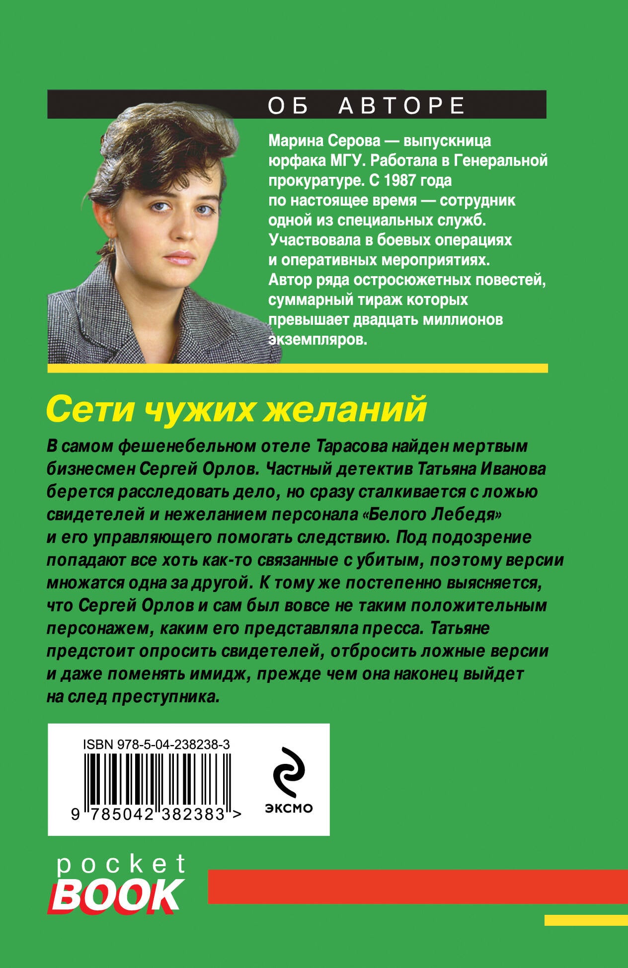 В самом фешенебельном отеле найден мертвым бизнесмен Сергей Орлов. Частный детектив Татьяна Иванова берется расследовать дело, но сразу сталкивается с ложью свидетелей и нежеланием персонала «Белого Лебедя» и его управляющего помогать следствию. Под подозрение попадают все хоть как-то связанные с убитым, поэтому версии множатся одна за другой. К тому же постепенно выясняется, что Сергей Орлов и сам был вовсе не таким положительным персонажем, каким его представляла пресса. Татьяне предстоит опросить множество свидетелей, отбросить ложные версии и даже поменять имидж, прежде чем она наконец выйдет на след преступника. Марина Серова - феномен современного отечественного детективного жанра. Выпускница юрфака МГУ, работала в Генеральной прокуратуре. Участвовала в оперативных мероприятиях. Автор ряда остросюжетных повестей, суммарный тираж которых превышает двадцать миллионов экземпляров.| Издательство | ООО "Издательство "Эксмо" |