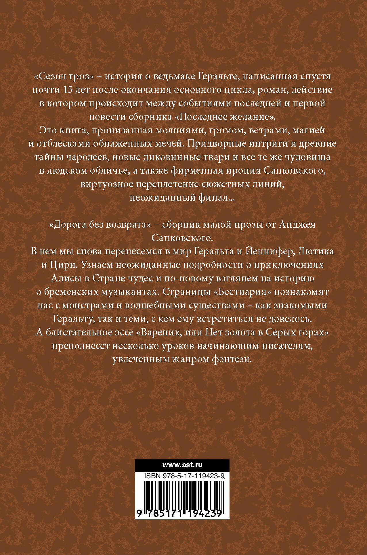 "Сезон гроз" - история о ведьмаке Геральте, написанная спустя почти 15 лет после окончания основного цикла, роман, действие в котором происходит между событиями последней и первой повести сборника "Последнее желание". Это книга, пронизанная молниями, громом, ветрами, магией и отблесками обнаженных мечей. Придворные интриги и древние тайны чародеев, новые диковинные твари и все те же чудовища в людском обличье, а также - фирменная ирония Сапковского, виртуозное переплетение сюжетных линий, неожиданный финал...