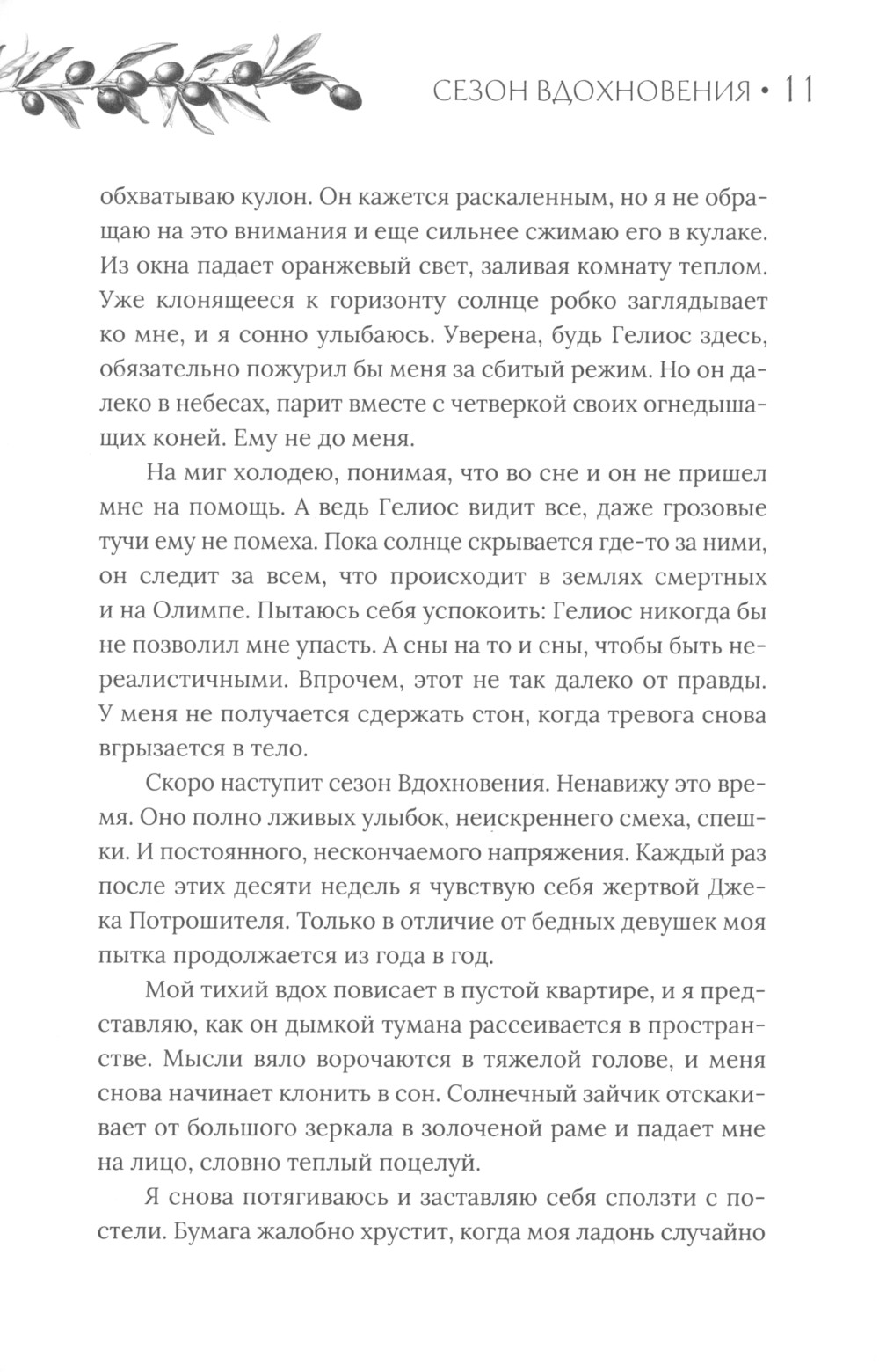 Сезон Вдохновения - конкурс, который уже более ста лет проходит на Олимпе. На нем девять муз должны раскрыть таланты смертных и представить перед богами нечто уникальное в своей сфере, будь то танец, поэзия или музыка. В награду Зевс исполнит любое желание победительницы. Клио живет в Санкт-Петербурге, ходит с сестрами в Мариинский театр и ведет мировую летопись, ведь она - муза истории. Ей трудно соперничать с талантами других муз, да и выигрывала она лишь однажды. Но в этом году Клио твердо намерена занять первое место. Только загадав желание, она сможет стать счастливой и быть с тем, кого любит. В погоне за выигрышем Клио не замечает, как сильнее отдаляется от сестер. Близится начало сезона Вдохновения, и ей предстоит решить: готова ли она отказаться от сестер ради любви? Быть может, счастье всё это время было не там, где она его искала?| Издательство | Полынь |