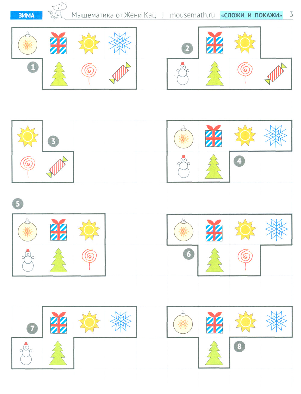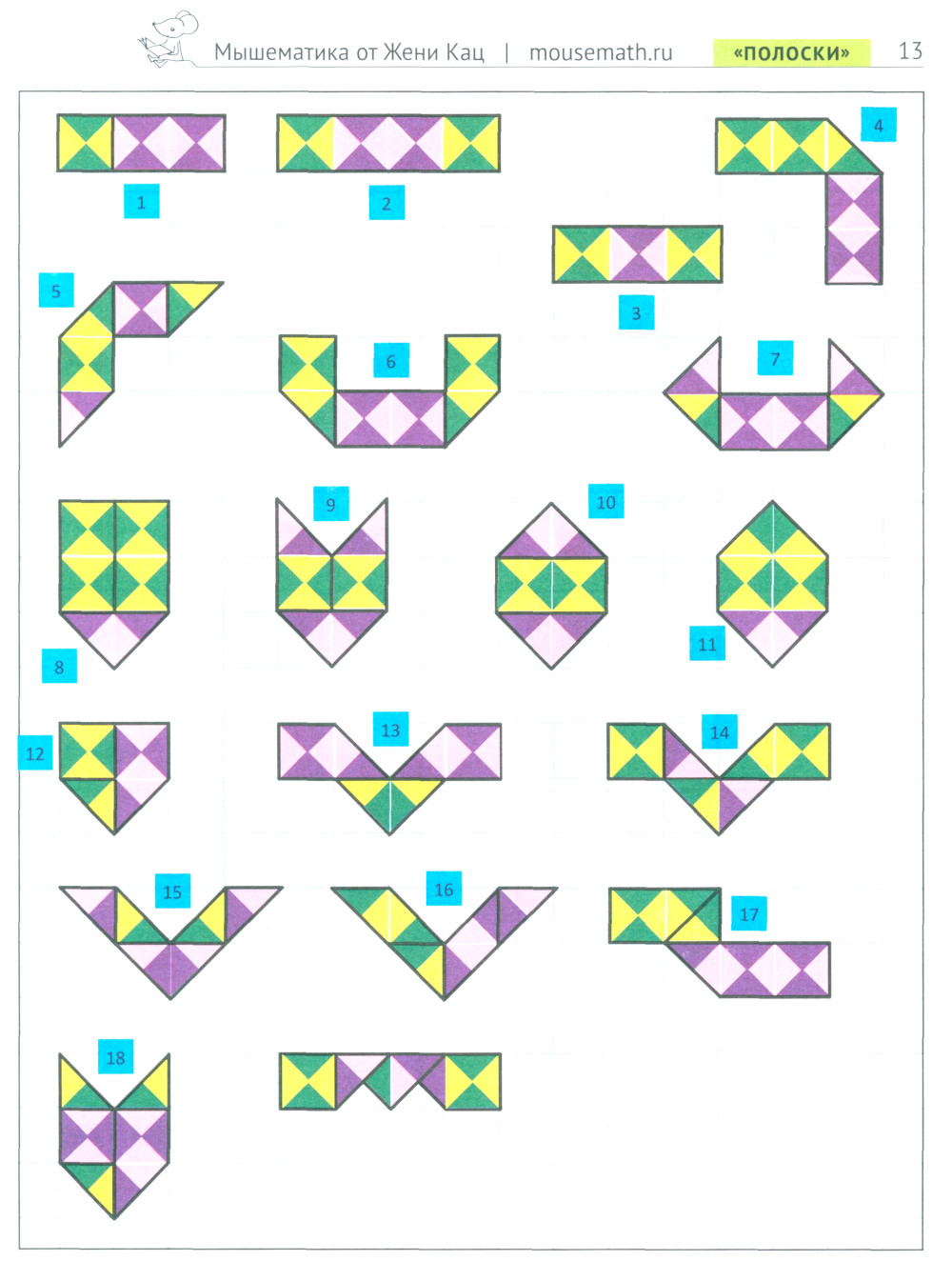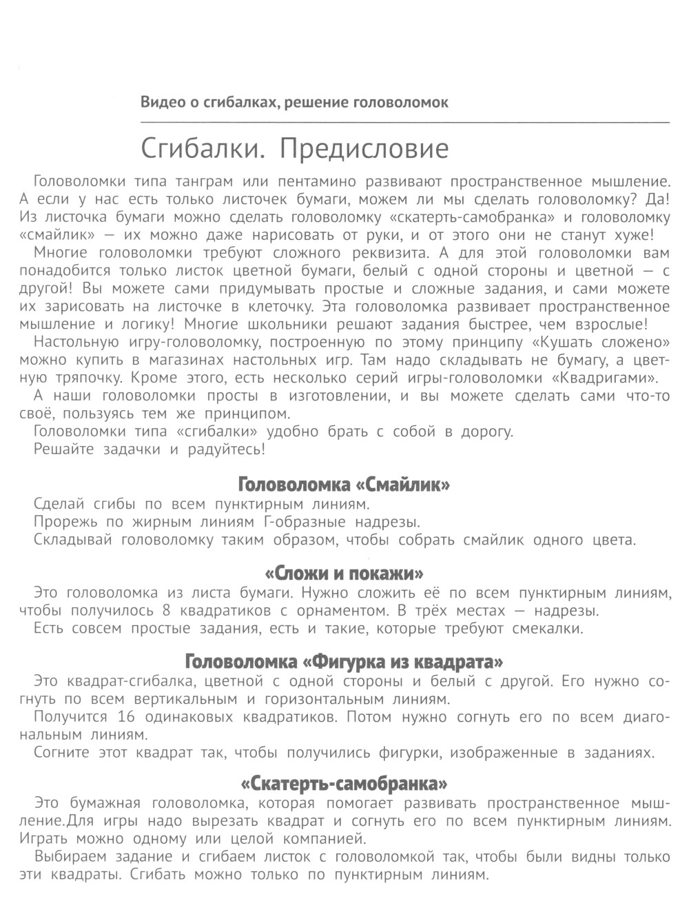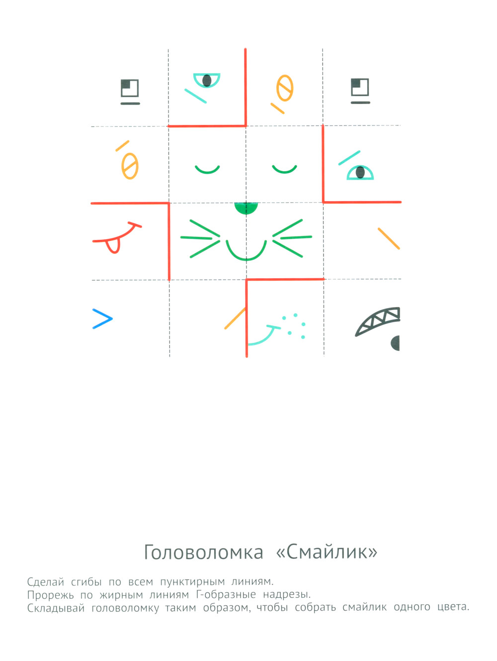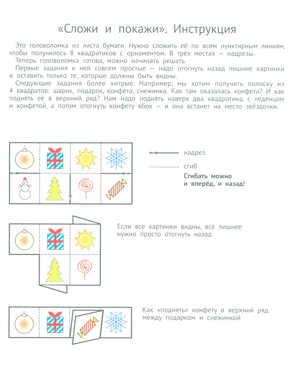 Головоломки типа танграм или пентамино развивают пространственное мышление. А если у нас есть только листочек бумаги, можем ли мы сделать головоломку? Да! Из листочка бумаги можно сделать головоломку «скатерть-самобранка» и головоломку «смайлик» - их можно даже нарисовать от руки, и от этого они не станут хуже! Многие головоломки требуют сложного реквизита. А для головоломки «Фигурка из квадрата» вам понадобится только листок цветной бумаги, белый с одной стороны и цветной - с другой. Вы можете сами придумывать простые и сложные задания, и сами можете их зарисовать на листочке в клеточку. Эта головоломка развивает пространственное мышление и логику. Многие школьники решают задания быстрее, чем взрослые! Настольную игру-головоломку «Кушать сложено», построенную по этому принципу, можно купить в магазинах настольных игр. Там надо складывать не бумагу, а цветную тряпочку. Кроме этого, есть несколько серий игры-головоломки «Квадригами». А наши головоломки просты в изготовлении, и вы можете сделать сами что-то своё, пользуясь тем же принципом. Головоломки типа «сгибалки» удобно брать с собой в дорогу. Решайте задачки и радуйтесь!| Издательство | МЦНМО |
