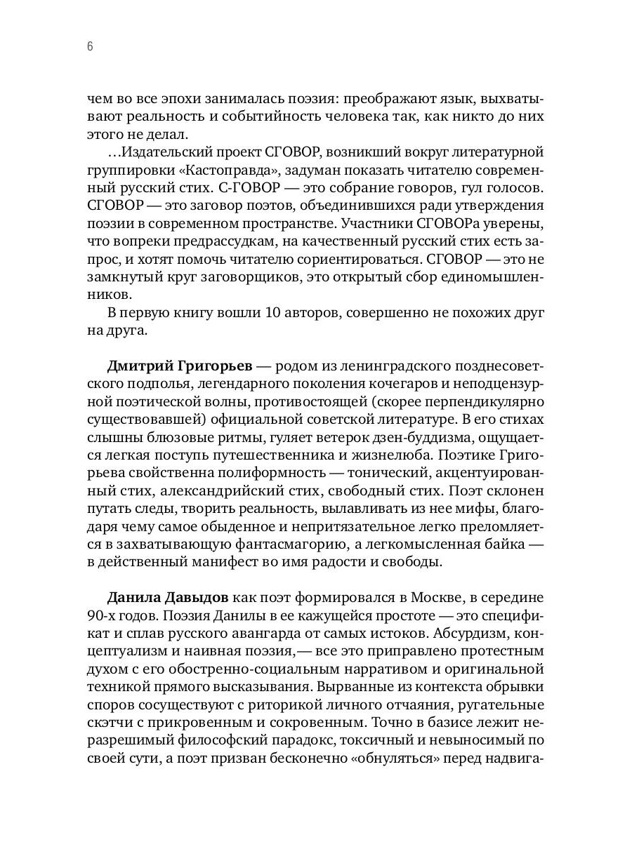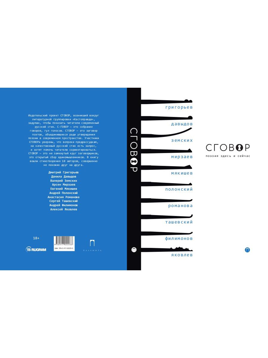 Издательский проект СГОВОР, возникший вокруг литературной группировки «Кастоправда», задуман, чтобы показать читателю современный русский стих. С-ГОВОР - это собрание говоров, гул голосов. СГОВОР - это заговор поэтов, объединившихся ради утверждения поэзии в современном пространстве. Участники СГОВОРа уверены, что вопреки предрассудкам, на качественный русский стих есть запрос, и хотят помочь читателю сориентироваться. СГОВОР - это не замкнутый круг заговорщиков, это открытый сбор единомышленников. В книгу вошли стихотворения 10 авторов, совершенно не похожих друг на друга.| Издательство | Т8 RUGRAM |