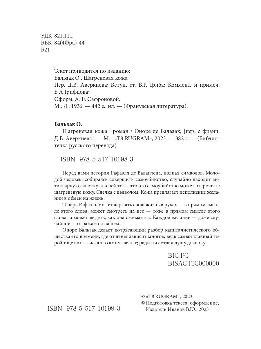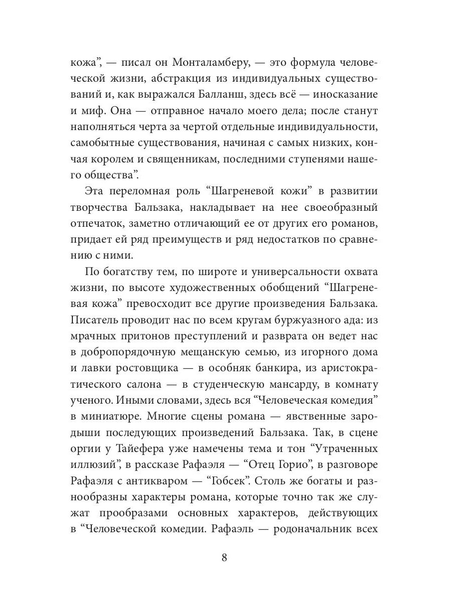 Перед вами история Рафаэля де Валантена, полная символов. Молодой человек, собираясь совершить самоубийство, случайно находит антикварную лавочку; а в ней то - что это самоубийство может отсрочить: шагреневую кожу. Сделка с дьяволом. Кожа предлагает исполнение желаний в обмен на жизнь. Теперь Рафаэль может держать свою жизнь в руках - в прямом смысле этого слова; может смотреть на нее - тоже в прямом смысле этого слова; и может видеть, как она сжимается. Каждое желание - даже случайное - отражается на нем. Оноре Бальзак делает потрясающий разбор капиталистического общества его времени, где от денег зависит многое; ведь самый главный герой ищет их - искал в самом начале; ради них отдал душу дьяволу.| Издательство | Т8 RUGRAM |