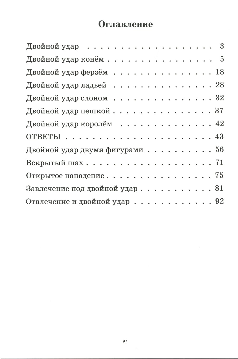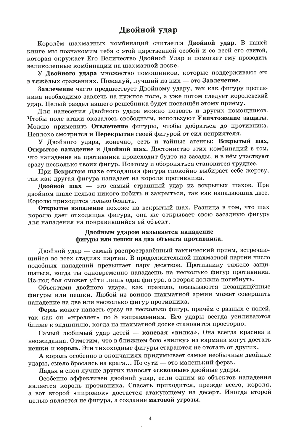 В новом задачнике юный шахматенок встретится с Королём шахматных комбинаций. Конечно, Его Величество Двойной Удар не может жить один, и у него должна быть свита помощников, которые помогают ему проводить свои великолепные комбинации. Лучший из помощников - Завлечение, и целый раздел нашего решебника будет посвящен этому приёму. Также мы познакомимся и с остальной свитой. Для нанесения Двойного удара можно позвать и других помощников. Чтобы поле атаки оказалось свободным, используют Уничтожение защиты или Отвлечение фигуры. Неплохо смотрится и Перекрытие своей фигурой от защищающегося противника. У Двойного удара, конечно, есть и тайные агенты: Вскрытый шах, Открытое нападение и Двойной шах. Изучив наши уроки и взяв штурмом Королевские задачи Двойного удара, наш решатель станет не меньше, чем принцем шахматных комбинаций. Как работать с нашим решебником? Если ребёнок занимается дома для всестороннего развития, то внимательно читайте вступление к каждой теме. Если вы тренер и учите детей в спортивной секции или в школе, то рекомендуем вам вместе со всей группой решить несколько задач из каждой новой темы на демонстрационной доске, а последующие позиции на диаграммах предложите юному шахматёнку решать самостоятельно на занятии или уже дома - как домашнее задание. Решения ваш потенциальный гроссмейстер должен записать под диаграммами.| Издательство | Изд.Калиниченко |